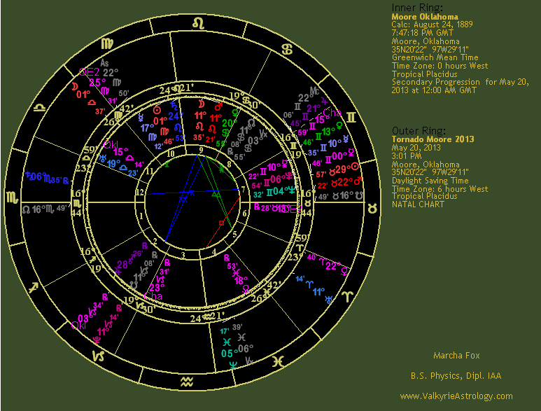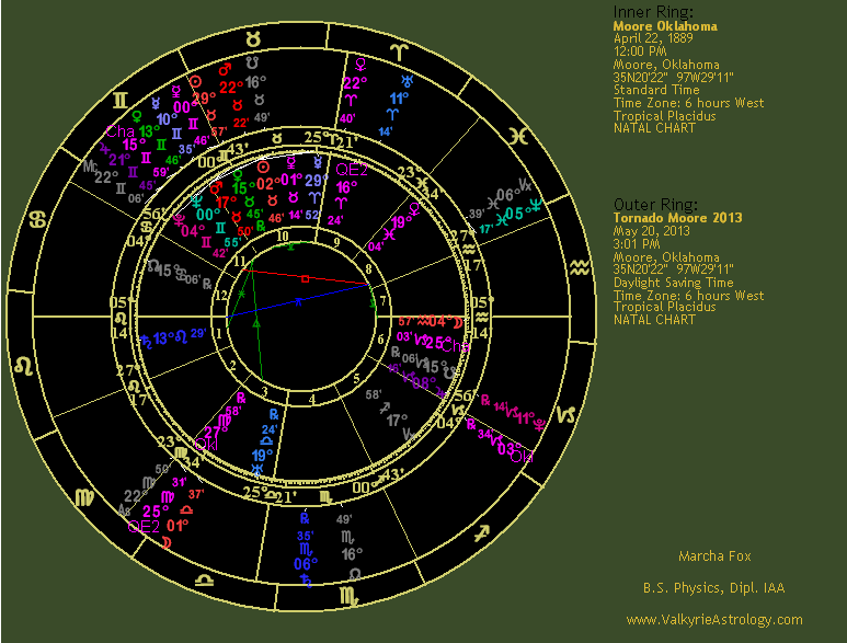 Mars is in debility in Taurus but often has a bulldozer effect which is apparent when you look at the damage wrought. Mars rules the 8th house of death and trines the ascendant, thus delivering his lethal effects. Mars is semisextile Jupiter, also in debility in Gemini where he tends to go in too many directions at once. Jupiter rules the 4th house of home, family and endings, suggesting a heavy influence in that area and conjunct the Midheaven in the 10th, indicating this was an event that would be viewed extensively and receive considerable attention by the public. Jupiter is in partile square with the ascendant, further inflating the effects on the town at a personal level. Numerous planets are in the 9th house which includes beliefs, expectations, higher education, publication, other cultures and long-distance travel. These include Mars, Sun, Mercury, Venus and asteroids Phaethon and Chaos. Undoubtedly news of this horrific storm were published far and wide and it traveled a rather long path. However, what comes to mind is how this town has been hit so many times by massive tornadoes which yields the potential message that these are not isolated events but should be expected to continue. It also highlights the lack of storm shelters which greatly contributed to the injuries and fatalities. Clearly the area had not learned it lesson from previous storms so this one drove it home, a form of higher learning, if you will, that Mother Nature will do as she pleases and it just may be that Moore is on her favorite tornado route for reasons unbeknownst to fragile humans. The Moon in the 1st house hints at the high degree of citywide emotions affected by the tragedy, particularly the deaths at Plaza Towers Elementary and is trining Phaethon, certainly indicative of a "crash and burn" scenario. Phaethon is in close but out-of-sign conjunction with the Sun, interesting in that the Moore natal chart also has a Sun - Phaethon conjunction. When natal aspects repeat by transit significant events often occur. Eris, minor planet of discord, is in the 8th house of death and sextile Jupiter, inflating her ability to stir things up. She is quincunx the ascendant, hopefully pushing for a change of direction and approach to preparedness and safety for the unfortunate towns in this region. |