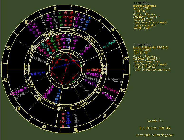 April Lunar Eclipse As if the Aries Ingress chart wasn't enough, the Lunar Eclipse on April 25 provided the coup de grace with transiting Mars and the Sun conjunct in Moore's 10th house of reputation and status indicating the potential for recognition related to a violent event. The square to the ascendant as well as the natal Moon showed it would be personal and emotional in nature. The Eclipse Moon in the 4th of endings effectively creates a Grand Square, typically an ominous indicator, especially with transiting Mercury, ruler of weather, opposing natal Uranus, ruler of tornadoes in charts representing a locations in the middle of Tornado Alley. Lunations such as the New or Full Moon typically energize a chart and sensitize it to subsequent transits and the effect of an eclipse will be even stronger. Thus, a difficult ingress coupled with an eclipse can bring a significant event. Transiting Neptune is in the 8th of death squaring Pluto, planet of death in the house of groups. He is also quincunx the ascendant, again implying a change is required due to deception regarding death. The transiting Sun - Mars conjunction is semisextile Pluto, another bad combination of energy. The Eclipse ascendant is in the 2nd house of possessions and land and squaring natal Pluto, more ominous indicators. Transiting Neptune is semisextile natal Moon in the 6th indicating compassionate service coupled with emotional involvement. Transiting Saturn is sextile natal Jupiter in the 6th suggesting the amount of massive rebuilding that will be necessary. Transiting Chaos is semisextile Venus, ruler of the 4th and thus suggesting a chaotic ending while transiting Jupiter, ruler of the 5th house that includes children, is also semisextile both Venus and Mars for a four-fold blast of energy that will be felt at home and abroad considering that the Jupiter - Chaos conjunction signifies expansive disorder and chaos. Transiting Mercury, Uranus and Eris are in the 9th of beliefs which calls attention to beliefs about weather being an issue. Asteroid 1998 QE2 is rising in the eclipse chart and partile trine Moore's Phaethon, subtle but viable indicators for upcoming trouble. |
