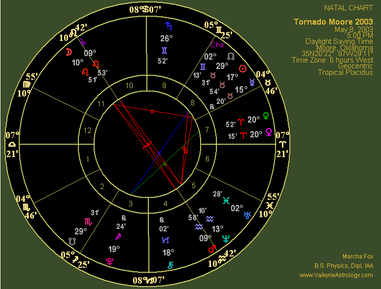 May 20, 2013 Moore Tornado "Birth" Chart This is the event chart for when the Moore tornado formed at 2:56 CDT in Newcastle. At first glance it doesn't look particularly ominous with only one hard aspect. However, but it's a rather bad one that in and of itself defines the chart given that it's connecting Uranus, ruler of tornadoes and Pluto, planet of death in EXACT square in angular houses which provides additional impact and energy. I also find it notable that 1998 QE2, the asteroid that made its closest approach to Earth on May 31, was in the 1st house within about four degrees of the ascendant. This is all the more interesting when you consider that it was in approximately the same house position in the El Reno tornado chart in spite of the fact the quick-moving asteroid had progressed into Scorpio. Pluto is in the 4th house of home environment and endings/new beginnings lending intense, destructive energy in Capricorn, the sign that rules structures. Pluto is also retrograde, suggesting going backwards as far as building is concerned. Uranus, planet of explosions, rebellion, disturbances and the unexpected as well as ruler of tornadoes is in the 7th of relationships and the sign of Aries, the most energetic and aggressive sign as previously noted. Furthermore, the Sun is in the last degree of Taurus; placement in the last degree of a fixed sign often denotes a permanent ending. This square is further strengthened by a closed loop aspect with a third component, Mercury, natural ruler of weather, which is sextile Uranus, natural ruler of tornadoes. A sextile is usually considered a "soft" aspect that denotes an opportunity but in this case the results were far from fortuitous and served to ignite one of the worst tornadoes on record. The final aspect, a quincunx between Mercury and Pluto, connects the natural ruler of weather with the natural ruler of death and destruction through an aspect that is unstable and necessitates an adjustment or change of course. Mercury is less than a degree out of orb, making this an extremely powerful loop of energy. Furthermore, Mercury is in Gemini, sign of his dignity, making him even stronger, plus he's the ruler of the Virgo Ascendant and rules the entire chart. Gemini is an Air Sign and Aries a Fire Sign, two elements that in this case combine a bit too well. Mercury is typically considered a neutral planet, i.e. not benefic and not malefic, but when connected with two malefics he obviously gets into the game.