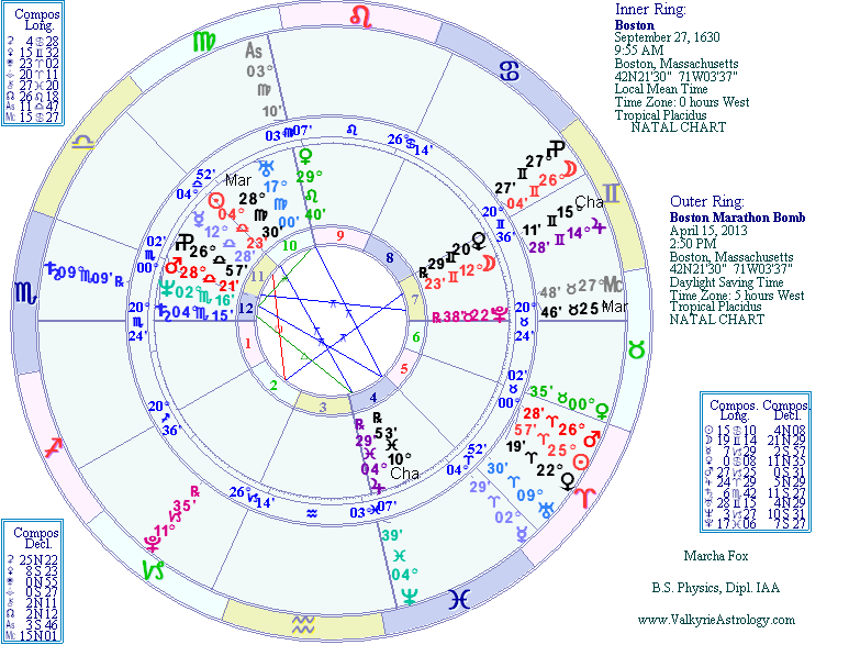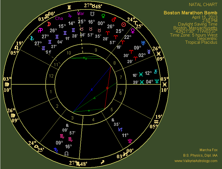 House placement is also telling. Saturn is in the 3rd house which includes siblings, neighbors, thoughts and ideas. It could refer to the local nature of the explosion that occurred on a city street or the idea to restructure through lethal means. [UPDATE: Suspects are brothers and lived locally.] Saturn's trine with Neptune in the 7th suggests not only dissolving an existing establishment but to deception. There are likely to be additional implications in this aspect which will become apparent as the investigation continues. [UPDATE: The two brothers were definitely "disguised" with regard to their true intent.] Neptune also represents idealism which can also be seen as a motivator but the 7th typically corresponds with relationships so there may have been insider elements involved. Pluto is in the 5th house which includes entertainment and sports events while Uranus is in the 8th house of death and transformation. [UPDATE 25 April 2013: The detonator used for the bombs was a remote control used for a toy car, another link to Pluto in the 5th house which includes children and toys with Pluto suggesting a subversive use of such a device.] House placement depends on the time of the event while the planets and signs are set. Mercury is in Aries in the 8th, suggesting violent thoughts and squaring the 5th house cusp of sporting events as well as quincunx the ascendant which it rules, pointing toward the premise of using terrorism to express one's beliefs. Mercury is also squaring the 11th house cusp which includes groups and goals, suggesting a group is behind the action as opposed to individuals. The next thing that seems to jump off this chart is not only the number of planets in Aries (which is fairly common for such events that frequently occur when the Sun is in Aries e.g. the Oklahoma City bombing) but the fact that the Sun and Mars are conjunct within a half of degree. The Sun is in the sign of his exaltation and Mars in dignity in the sign he rules, making both strong. Furthermore, 25:43 degrees of all cardinal signs, of which Aries is one, is particularly significant and strong as well. Both the Sun and Mars are in the 9th house which comprises such things as beliefs, political ideologies, religion and other cultures, implying a violent protest related to beliefs. [UPDATE 25 April 2013: The surviving suspect has stated that they learned how to make the bomb from Inspire, a magazine for terrorists. Publications are also 9th house.] The Sun rules the 12th house of hidden enemies and Mars rules the 9th of beliefs and is the ancient ruler of the 4th of endings. The Sun and Mars are also at the eye of a yod connecting the cusps of the 2nd and 4th houses where the 2nd involves possessions and material objects including the body and the 4th is the house of endings and new beginnings, perhaps suggesting a new cycle of domestic terrorism has begun. The sextile from the Sun and Mars to the Moon in the 10th brings an emotional element which will be expressed publicly and before the world. Looking a bit closer at the 10th house you can see Jupiter conjunct the asteroid Chaos, which is certainly appropriate as well, particularly with Jupiter also the ruler of the 8th house. Eris, a minor planet that represents discord, is in the 8th of death just shy of the 9th house cusp of beliefs, further pointing toward violent acts related to beliefs. It's interesting that so far the ones wanted for questioning are two individuals, conveniently represented by Gemini where the Moon, Jupiter and Chaos reside. Gemini is not on any cusp, isolating it in a condition known as interception, which tends to intensify the energy. Mercury rules Gemini as well as the Virgo ascendant, further tying in the Aries energy hailing from the 8th house of death. [UPDATE: Not only was it two individuals but they were brothers, even more appropriate for Gemini. The pair was from Chechnya, a Russian province. The asteroid "Marathon" is semisextile both the Sun/Mars pair and the Moon, directly between them and only two degrees off the Midheaven showing the marathon's prominence and the asteroid "Russia" is conjunct True Lilith and sextile Sun/Mars, linking the pair's national origins with the deed. Lilith has implications regarding the fact that one of those killed was a child which is right up her insidious alley.]