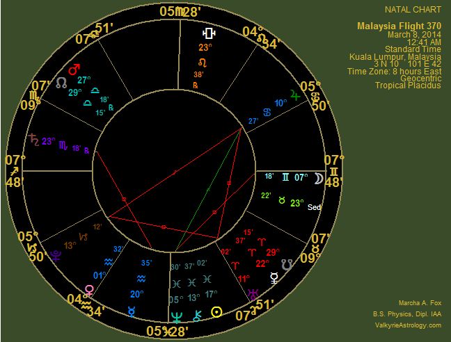 Passengers are often associated with the sign, Gemini, where the Moon, ruler of the 8th house of death, is placed and setting. The Moon is within the 6th house of health, work and service with the square with Neptune implying the possibility of the plane ditching in the water. Neptune at the bottom of the chart has implications for the plane being in the depths of the ocean as well, particularly considering the trine to Jupiter, ruler of the chart, also in a water sign, and representative of the flight itself. Obviously of the thousands of flights that occur daily several of them will have 8th house planets and aspects which will not result in problems. Nonetheless, an event chart will capture its essence. Neptune could also indicate asphyxiation or loss of cabin pressure as suggested by news reports. Those of you familiar with astrological charts may be wondering which planet is placed in the 5th house next to the Lunar South Node. It's white and looks similar to Mercury but it's actually the asteroid, Phaethon, son of Apollo, who lost control of the Sun God's chariot and crashed into the Sun because he over-estimated his abilities. This asteroid is often associated with accidents. The quincunx to Saturn suggests a change of course or direction and being the "crash and burn" asteroid likewise does not look favorable placed in the 5th house, which includes speculations and ego. Perhaps difficulties were encountered that went beyond the skill of the crew to negotiate. Nonetheless, evidence regarding the plane's location and altitude suggests a positive degree of piloting skill. Mars retrograde and unaspected in Libra in the 11th house of groups suggests the numerous countries participating in the search yet not necessarily working together in an organized manner. Being retrograde points toward the lack of progress and not getting anywhere with the search. Note that the Sun, ruler of the 9th house that includes long-distance travel, is in a water sign at the bottom of the chart which suits the trip across water but could also be indicative of ditching, especially with the asteroid, Chiron, the "wounded healer" between Neptune and the Sun. The Sun rules the 9th house, which includes long distance travel, other cultures, as well as beliefs and expectations with the Sun in the house of endings and new beginnings, which could also relate to a hijacker. Neptune is the planet of deception as well with its prominence in this chart indicative of numerous possibilities. Looking at the chart for the last