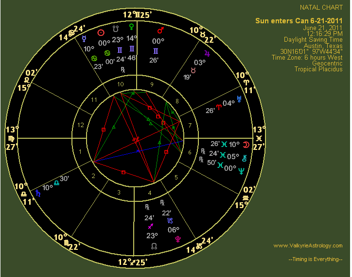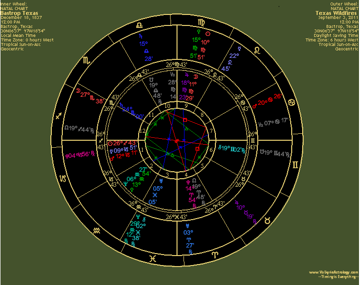 Texas has been plagued with an outbreak of wildfires since Spring 2011, largely due to the ongoing drought and record-breaking temperatures which have seared the state for several years, though this has been the worst year yet. I know, I live here. In September the fires worsened with one in the small town of Bastrop, approximately 30 miles southeast of Austin, the state's capital, making national news. At this writing wildfires have destroyed over a 3,000,000 acres and a thousand homes have been destroyed, including several in an exclusive community known as Steiner Ranch north of Austin. (For video of the Bastrop fire go to http://www.kvue.com/video/featured-videos/Raw-video-Bastrop-fire-aerials-96-129341293.html and for video of the Steiner Ranch fire go to http://www.kvue.com/video/featured-videos/Raw-video-Steiner-Ranch-aerials-129265768.html. ) Astro-weather 101: Astrological attempts to predict weather typically focus on what is known as an Ingress Chart which marks when the Sun enters a Cardinal Sign (Aries, Cancer, Libra, and Capricorn). Planets resident within the angular houses (1st, 4th, 7th, and 10th) and any aspects involving them are primarily considered, largely due to the fact these houses relate zodiacally to the Cardinal Signs which also mark the beginning of the seasons. In other words, Spring begins (in the Northern Hemisphere) when the Sun goes into Aries at the vernal equinox; Summer begins when the Sun goes into Cancer; Autumn begins at the autumnal equinox when the Sun enters Libra; and Winter begins at the winter solstice when the Sun enters Capricorn. (In the Southern Hemisphere these are all reversed.) The outbreak of