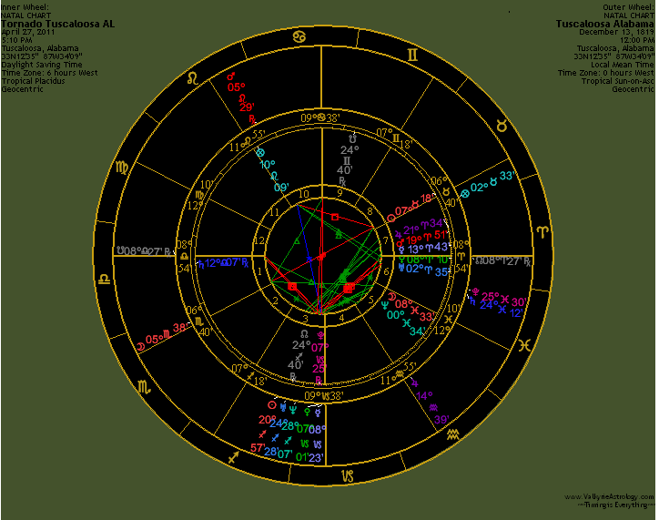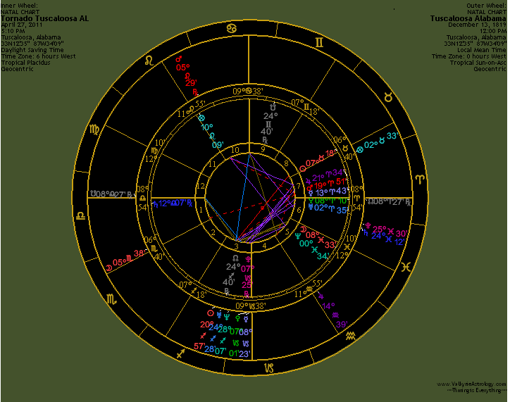 Ironically, the most active month for tornadoes is typically May, yet this April saw more tornadoes than what is usually seen in six months. Debris was tossed a mile and a half high and scattered as far as 115 miles from its source, over 300 lives were lost, and property damage will be between $2 - $5 billion dollars. While such storms ravaged several states including Alabama, Arkansas, Georgia, Illinois, Iowa, Louisiana, Mississippi, Missouri, North Carolina, Oklahoma, Tennessee, Texas, Virginia and Wisconsin this astrological overview will focus on the F-4 tornado that struck Tuscaloosa, Alabama. You may also be interested in astrological Charts for the same storm in Birmingham, Alabama; a story from the tornado zone; NASA satellite view of the storm track and a slideshow of the aftermath by Greg McNair (http://www.facebook.com/l/39223uTgZcAiHoyJBkBu4EHwEaQ/www.aerialsouth.com ). NOTE: The original posting of this blog was done with the incorrect time and has been updated accordingly. The correct time, as expected, yielded an even more ominous chart which is shown below. The correct time was attained with many thanks from the posting as well as an email from the following: http://www.youtube.com/user/Namerifrats#p/a/f/2/J9Oszy_dGJY. |