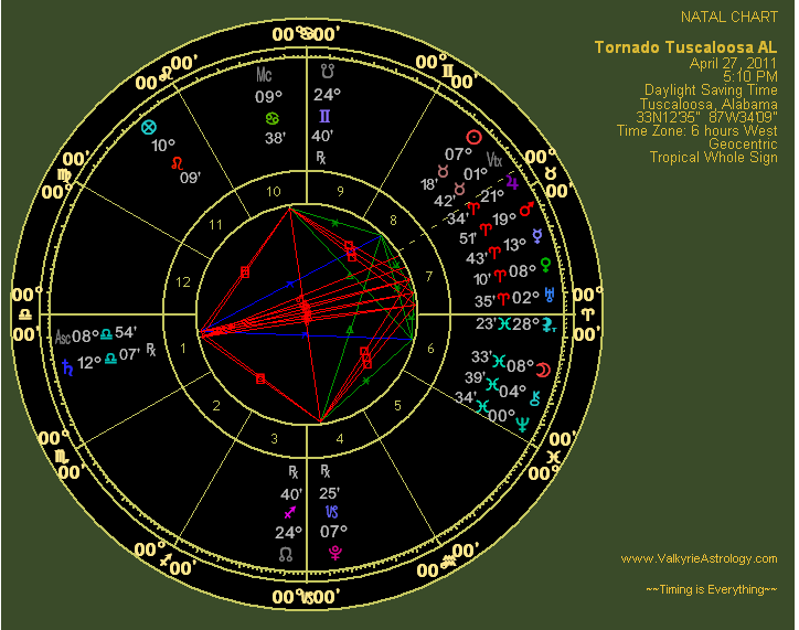 Venus rising before the Sun makes her the Goddess of War and she's in partile (same degree) opposition to the Ascendant, making this attack very personal for the people of Tuscaloosa. Using a wide orb, all planets in aggressive Aries are opposing Saturn, ruler of structure. The Sun is in the 8th house of death and trining Pluto, god of the Underworld and natural ruler of the 8th, with Pluto squaring Saturn as well as Uranus which brings surprises, disruptions and explosions, which were numerous as transformers blew away in the tornado's path. Warrior Venus and Mercury are in Aries, all components of the Grand Cross, the most stressful aspect pattern there is, and normally comprising four squares and two oppositions. However, this Grand Cross has 10 squares and 9 oppositions! The 8th house is also the house of transformations and intense experiences along with debt and shared resources; clearly those who survived this horrendous event will never be the same and the financial implications are staggering. The Sun is quincunx the Ascendant, indicating an adjustment or trouble on the way. The Moon in Pisces, Sign of martyrs and saviors and the zodiacal 12th house, is in a sextile pattern with both the Sun and Pluto, indicating the emotional impact of the event upon the common people and also implies the extent of physical injury and death incurred. The Moon is in partile quincunx to the Ascendant, combined with the quincunx from the Sun forming a Yod, also known as a Finger of God, with the Sun (blue arrow with green base in chart.) It doesn't take much imagination to see the yod and multiple oppositions as a type of the tornado itself by shape and form. Yods typically literally point to significant, life-changing, and fated events. The presence of the asteroid Chiron, the "wounded healer" in the 6th house of health is also apropos. Uranus, Venus and Mercury all square the Midheaven, representing the public nature of the event and the affect it would have on Tuscaloosa's public image, with all contributing to the Grand Cross; this was not the usual run-of-the-mill tornado only seen on "Storm Chasers" or The Weather Channel. This tornado broke records and will go down in the history books; so far it is the 2nd deadliest outbreak on record; when all is said and done it could be the 1st. Reinforcing this significance are the Vertex in the 8th house of death and transformations suggesting a fated situation, with the South Node in the 9th indicating loss which will affect its university and churches and receive vast attention from the media, worldwide.