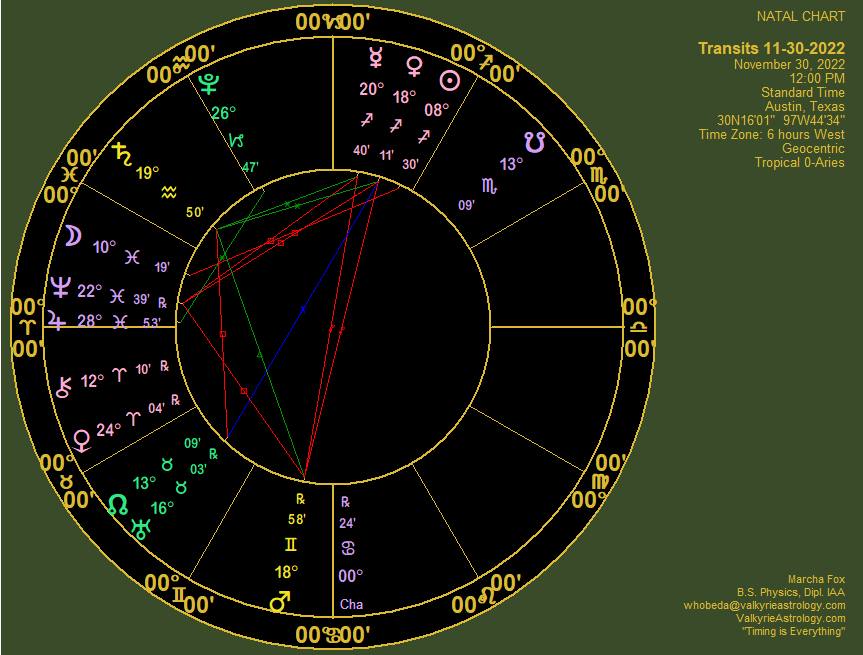 Wednesday, 30 November 2022 Another reverberating T-square is forming as Mercury and Venus square Neptune and oppose Mars. This brings more pressure from Sagittarius, which includes such things as academia, other cultures, legal matters, philosophy of life, beliefs and expectations, politics and religion, to deceptive Neptune and calls for balance with Mars in Gemini reviewing information he may have missed or misinterpreted before. Saturn continues to mitigate either through structure or authority. Unexpected changes of direction or Catch-22s are likely so don't be surprised if things don't go as planned. Sun: Sagittarius * Lunar Phase: 1st Quarter * Moon Sign: Pisces |