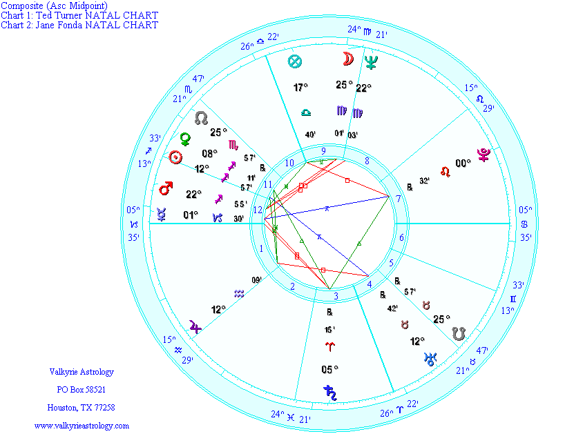 We can always learn something from another person, whether it helps us to grow or simply illustrates the old saying, "No life is ever wasted. You can always serve as a bad example." Another factor to be considered is that even though two individuals' signs may be in square, it's still possible that their actual Suns will make a positive aspect to one another. Remember there are thirty degrees in each sign and even with a tight orb of a degree there is a lot of "wiggle room." In other words, if one person has their Sun at zero degrees Cancer and the other has their Sun at 29 degrees Libra, their Suns are in trine even though the signs themselves are squared, since aspects between signs themselves are based on midpoints. The converse is also true. If someone has their Sun at 29 degrees Scorpio and another person has theirs at zero degrees Pisces, their Suns would be squared even though their signs are in trine. These would often include the couples that "break all the astrological rules" of compatibility. Everything astrological says they shouldn't get a long, but they do. So there are no hard and fast rules and astrology, as accurate as it may be for predicting personality, has no easy answers. If you want to have some fun with how the elements get along figuratively, see our Figurative Elemental Interactions table. Other Chart Techniques One textbook means for determining whom a person will be attracted to is to look at the sign where Mars is located in the woman's Natal chart and conversely, the location of Venus in the man's Natal chart. The odds are high that they will find themselves drawn to members of the opposite sex with either a Sun Sign or Ascendant in that sign. The caveat here, however, is that just because they're attracted to them doesn't mean they'll be compatible! Taking it a step further, any aspects made to the Ruler of the 7th House of Relationships can hold clues as well. Planets aspecting the Ruler may be the ruling planets of those with whom they're inclined (or possibly destined) to have a serious relationship. Another thing to look for is Sun or Moon signs located in reciprocal Houses. For example, for a Pisces man and Leo woman, if his ascendant were Aquarius then his 7th House would be Leo and for hers to be reciprocal she would have a Virgo ascendant and her 7th House would be Pisces. These can result in strong attractions, even if other compatibilities are missing. For 7th House reciprocity you may have a strong feeling of belonging together or a strong sense of partnership. For the 8th House, there could be a very strong sexual attraction that can't be explained by any other aspect. When these two people look each other in the eye everything disappears but the attraction between them. However, not all problems can be solved in bed (though it's not always a bad place to start....) Composite Charts Composite Charts combine the Natal or Progressed chart of the two individuals and create a single chart comprised of the midpoints of their individual planets. This chart delineates the relationship itself as a living entity and captures areas of focus, emphasis and the general personality of the partnership, based on the blending of energy each person brings. The House placement of the Composite Sun will reveal the relationship's foundation. Note in the example chart which depicts the Composite for Ted Turner and Jane Fonda, that the Sun is in the 11th House of groups. Obviously this couple is deeply entrenched in the media and entertainment world. Of note, also, is that Pluto is in the Composite 7th House, hinting at the significant amount of power this couple wields collectively. Other possible relationship emphasis for the Sun in the Houses are contained in the table below. Relationships are never easy. Sometimes the most challenging are also the most rewarding. Not to quote another cliché, but often the course of true love does NOT run smoothly. Who knows what karma you may be dealing with? There are no hard and fast rules regarding who will make a fantastic couple as opposed to who won't. Like they say, rules are made to be broken. However, the general principles of astrology hold true and provide numerous insights into the behavior you can expect from another person. Whether or not you'll be able to deal with it is entirely up to you.