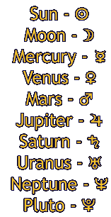 For each of the Sun Signs, the ruling planet largely defines the overall theme or focus of those born under that sign. There are exceptions, of course, particularly when a person has very strong influences such as a stellium, i.e. three or more planets in a single sign, which can counter-balance the Sun Sign. However, even as the Sun is a major influence in our lives generally, the placement of the Sun will usually define our basic character, which will be further defined by the ruling planet. Other planets besides your Sign Ruler are considered Personal Planets as well. Each planet has an elliptical orbit, which carries it around the sun in a specific period of time as noted above. Mercury makes a trip around the Sun quite quickly (approximately 88 days) while Pluto will not make a complete circuit in your lifetime (248 years). Thus the slower moving planets that remain in a sign for several years are said to have a "generational effect" since all the people born during a given period will have those planets in the same sign, giving them similar characteristics. When planet returns to the position it holds on your Natal Chart, you experience what is called a Planetary Return, which starts a new cycle related to whatever that particular planet rules. More detailed information is contained in the section on Planetary Returns. The basics for the various planets are contained below. Follow the links in the above table to a more detailed astrological description of each. (Hyperlinks below take you to a physical description of the planet at a NASA website.) |