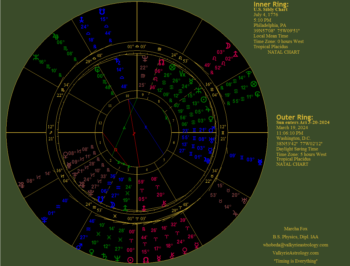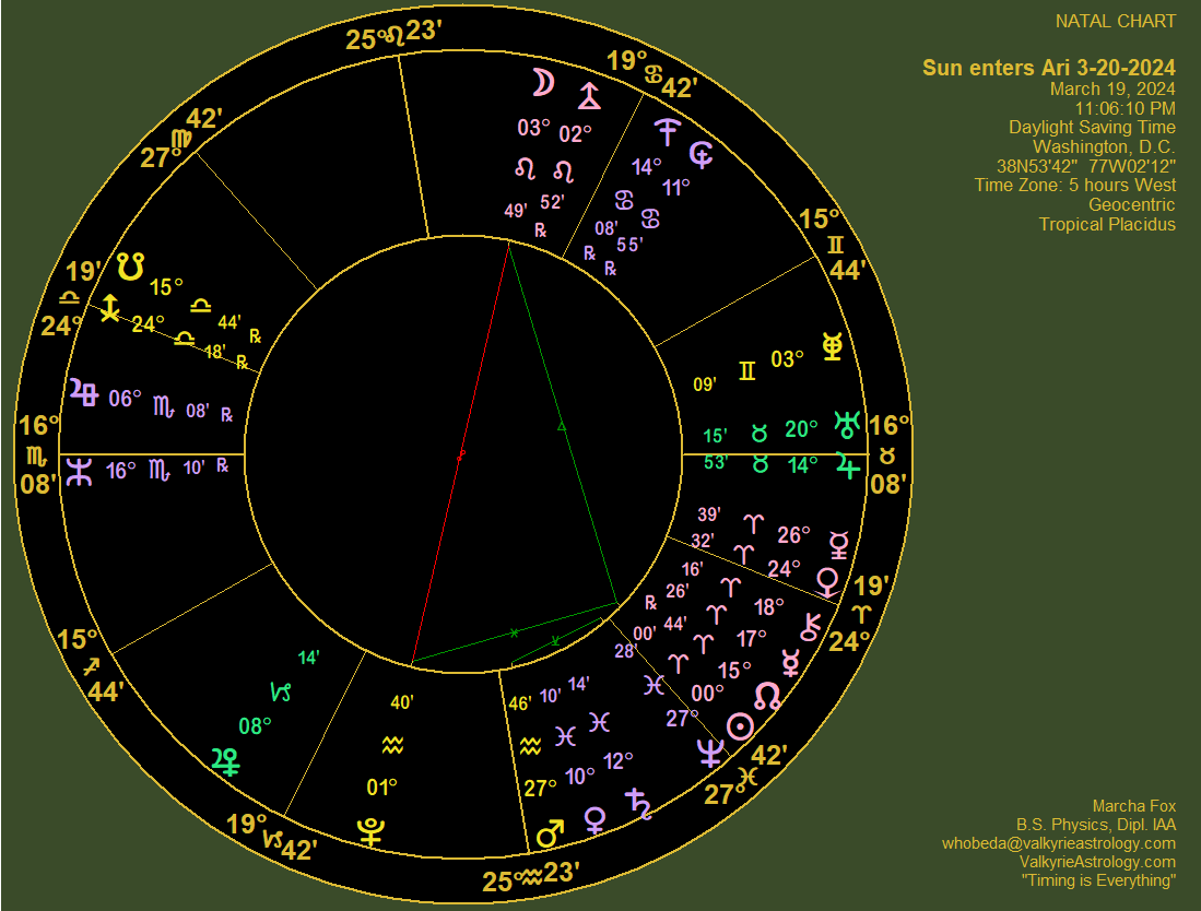 follow the ingress further define coming events. [NOTE:--For those of you with an eagle eye, the chart dates looks contradictory. The header is based on GMT and programmed into my astrological software, while the chart is for EDT, so it's different dates in the two locations.] Sun/5th/Aries