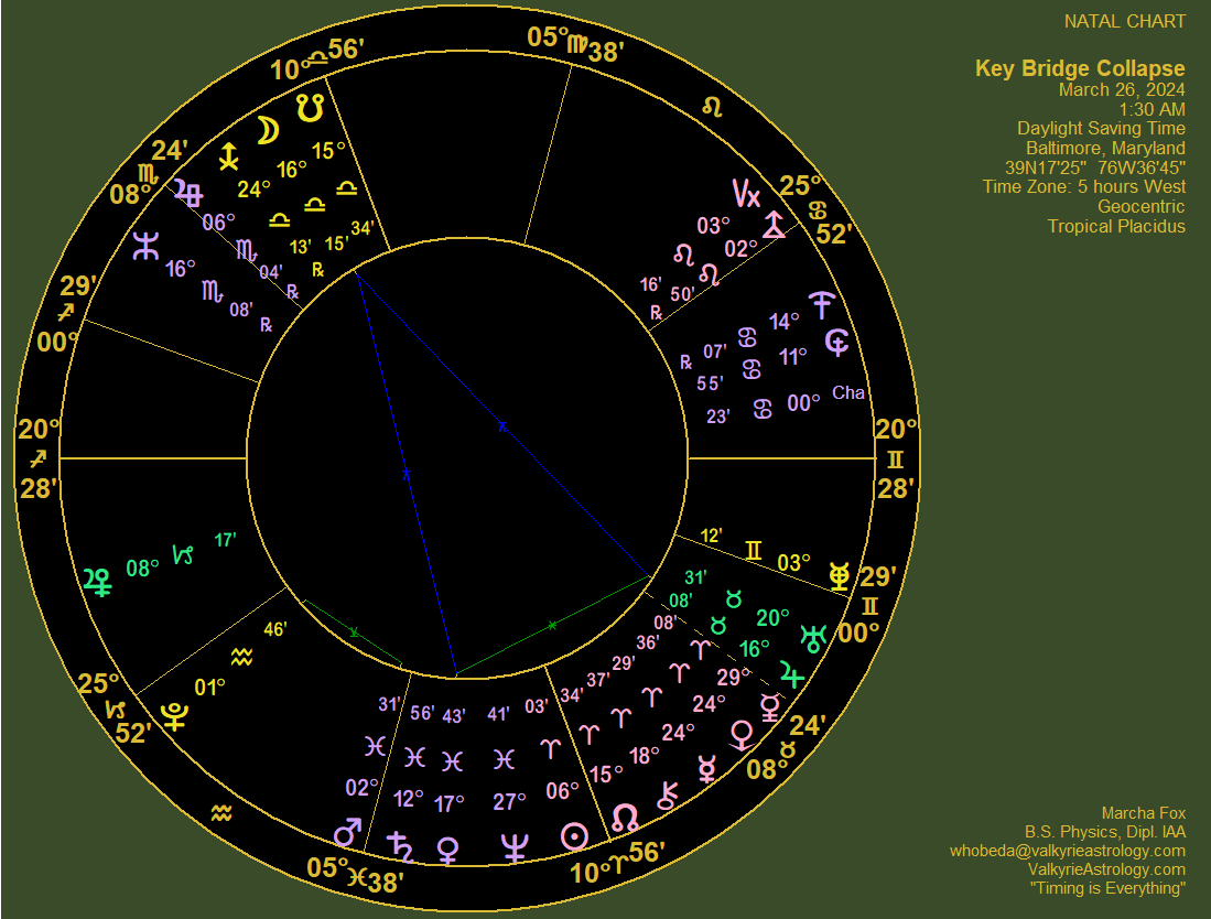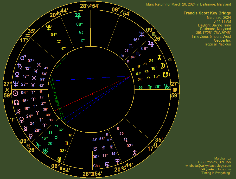 placement in the 10th, making the event The 4th house of endings is loaded. The North Node, Chiron, Mercury, Eris and Phaethon, all lending another bit of information. Mercury conjunct Eris relates to the perpetrators while Chiron bespeaks the unfortunate workers who were killed, legal immigrants from Mexico and Guatemala doing repair work at the time. Pluto and Mars semisextile on the fringes of the 2nd show the financial impact as well as the violent and potentially intentional act. Cupido in the 1st brings people together in shock and mourning. (For more philosophical insights into the event's impact, please see the previous blog.) The Mars return, which occurred a few hours later, was very similar and shown below. The yod shifted as the Moon moved, an opposition developing between the Moon and Chiron, suggesting tragic loss of life. Uranus has joined the yod, showing the sudden, unexpected demise. Chaos, Hades, and Kronos have moved to the 4th house of endings. Chaos is notably at 00:23 Cancer, an anaretic "world point" showing a position that has world-wide influence. That, of course, applies not only to this event, but to the world at large, which is without doubt in chaos these days. Moon/7th, ruler of 5th of local