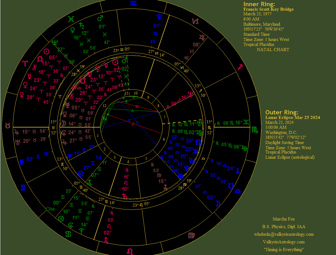 The "birth" information for the bridge was easily found on the internet. Oddly enough, it was March 23, 1977, indicating the bridge had just had a solar return, which we will look at as well. The time it opened to traffic was not noted, but I reasoned that it would have probably been in the morning, perhaps at the beginning of commuter hour. The house structure seems to fit so I suspect it was pretty close. Lunar eclipse with the bridge's