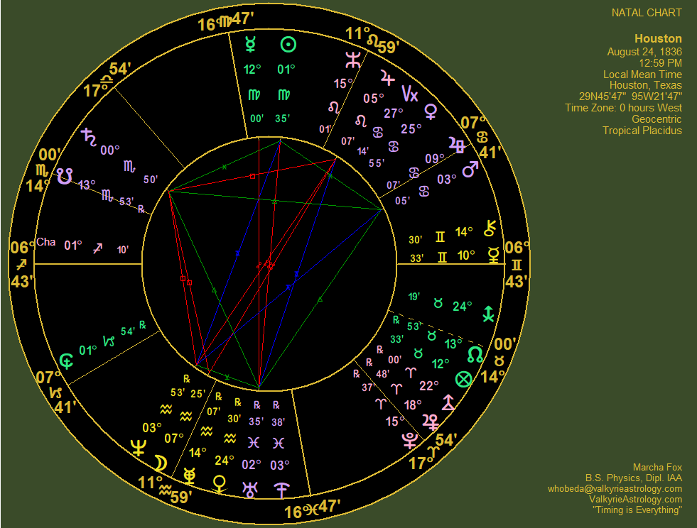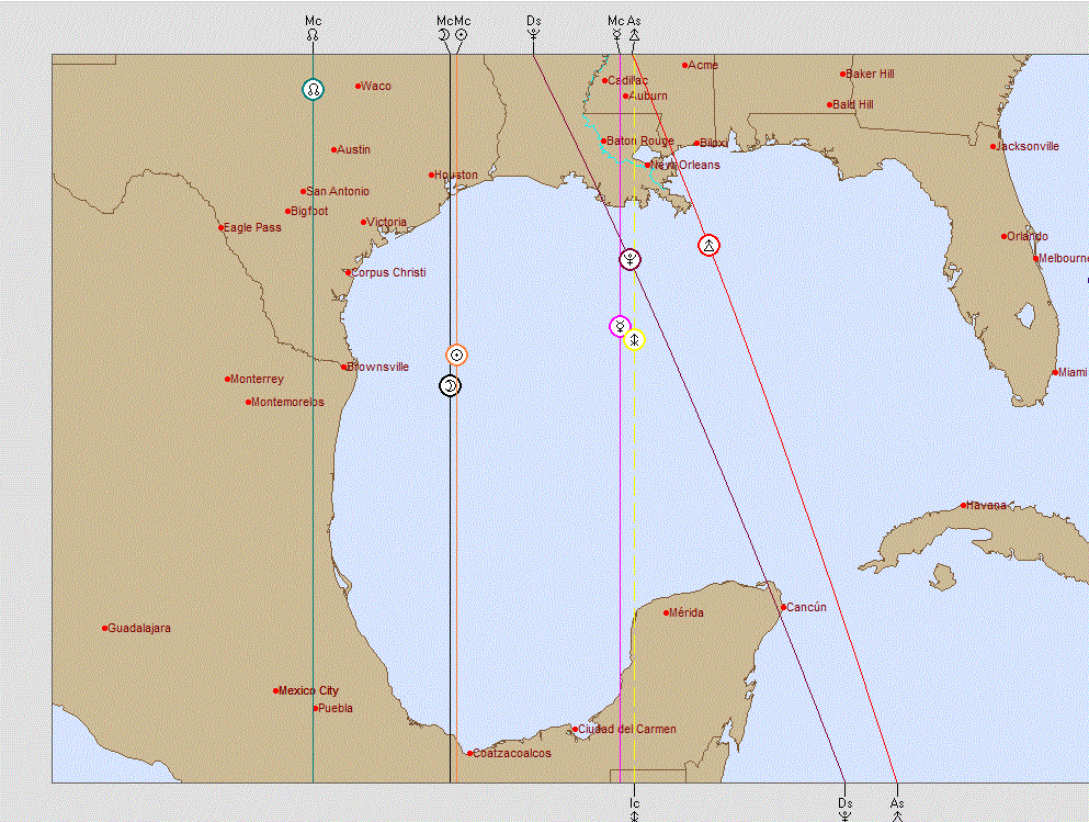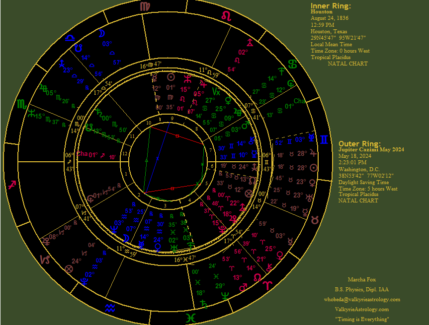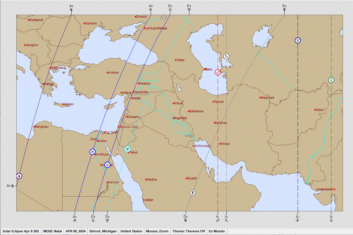 the April 8 eclipse went right over it. Hmmmm..... If you're having trouble understanding the map, it represents the location of the planets, Trans-Neptunians, and Lunar Nodes with respect to location. For the March 25 Lunar Eclipse, that bad-boy, Hades, was over Chesapeake Bay from which the Port of Baltimore extends, where the bridge collapsed the next day. There are any number of likely targets in Houston. There are various refineries, chemical plants, and National Icons such as NASA's Johnson Space Center, the location of Mission Control. Its also prone to hurricanes and other severe weather events. Since nothing has occurred (YET) in the New Madrid area, I suspect that any activity there and in South Texas will come later when a malefic planet is over the area for a lunation or other cosmic event. For the April 8 eclipse, Mars was on Tehran's IC (Imum Coeli) and Jupiter was on Israel's Descendant (map below). The war started shortly thereafter. Other event indicators included Pluto on Rome's IC and Vulcanus on its MC. On April 8th the Vatican issued a statement of policy on transgenderism. Indonesia had Pluto was on the ascendant and Vulcanus on the Descendant for the eclipse. That country suffered a massive volcanic eruption on April 30, 2024. These locales all were touched by a malefic planet on an angle of the transit chart for the eclipse. This shows that eclipses have an impact anywhere, not just along the path of visibility, though it also has significance. My concern for Houston derives from the eclipse being directly overhead. Looking at Houston's Natal Chart shows it has various "hot" points. The biwheel with the transits for May 18 form an odd aspect pattern, with the quincunx from Pluto to Houston's Sun suspicious. This triggers the natal yod with Neptune in the 2nd House of resources at the eye with Mars in the 7th and the Sun in the 9th of other countries. Other aspects trigger both the natal Grand Water Trine and T-squares. The asteroid, Chaos, sextile the Sun and trining Saturn doesn't look friendly, either, as well as the quincunx to natal Chaos. These aspect patterns all triggered at once by the Jupiter Cazimi present a huge energy exchange. Coupled with that of the eclipse right overhead, this could bring something significant. Neptune at the eye of the yod plus a Grand Water Trine comprised of Saturn, Uranus and Mars certainly hint at the importance of water to what is now the 3rd largest city in the USA, for good and for ill. The Port and its economic influence is favorable for the area; not so good, the implication for hurricanes. Neptune also rules oil, the petroleum business another big influence for the area. Hmmmm. That's a tough one. To get a more accurate idea I'd have to look at other natal charts such as the one for specific refineries, chemical plants, NASA, and so forth. The Baltimore bridge collapse was extremely obvious upon reviewing those charts, but knowing to check there before the fact was pretty much impossible. It's always obvious after-the-fact, but making predictions is extremely difficult. The cazimi as well as a partile conjunction between Venus and Uranus in the 6th house along with Phaethon, the "crash and burn" asteroid suggest involvement of the working class and health issues. Which brings to mind there's a huge medical center there as well. As far as icons are concerned, given Mercury, Eris, and Chiron transiting the 5th house, the San Jacinto monument comes to mind. Eris squares natal Venus/8th, ruler of the 6th. Especially in the context of all the immigration issues, perhaps it will be a target as the symbol for when Texas defeated Mexico. The way to take down a culture and a country definitely involves destroying its history and that which is meaningful. Hades proved his power with the bridge disaster. Asteroid Chaos opposing natal Hades doesn't look good. Transiting Hades sextile Houston Mercury/9th doesn't look good, either. Vulcanus quincunx Houston Uranus is another one that's troubling. The Venus-Uranus conjunction squares Houston Eris in the 3rd while transiting Eris sextiles its natal counterpart. This implies it's going to involve immigrants who may stir up some trouble with demands. The transiting Moon in the 10th suggests a strong, public emotional reaction. After May 18, if anything happens come back for an update. At that point I'll be able to see it clearly. Again, if everyone is safe that's good enough. These events are going to play out somehow, but may be too small or seemingly insignificant to be reported in the mass media. But it looks like something is heading that way. There will be a lot to learn from these eclipses and how much speculation proves to be accurate, both on the Biblical side as well as teaching a lot about using the power of eclipses to predict future events. As an astrologer, I don't believe in coincidences and there are certainly a plethora of them operating. The recent parade of unusual cosmic events has been unprecedented as well with the state of the world unstable enough that anything could happen. |