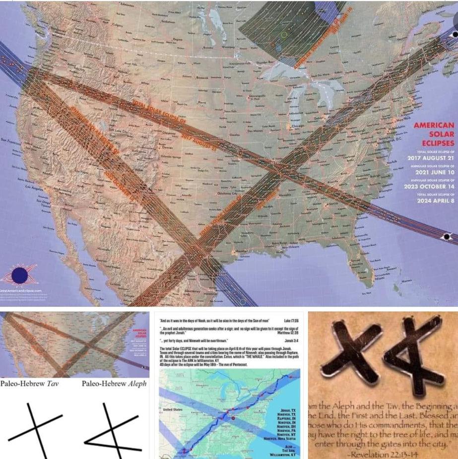 Various references were made to Bible prophecy regarding the April 8 Total Solar Eclipse. These included the pattern formed by three paths of visibility from eclipses on August 21, 2017, October 23, 2023, and the latest on April 8, 2024. These patterns matched those of the Hebrew letters for Alpha and Omega (see below). Everyone was holding their breath on April 8, wondering what would happen. There were numerous speculations, including those in my book "The Dark Side of Eclipses: Do the Heavens still Issue Warning of Things to Come?" that pointed toward the intersections of those paths in potentially hot areas: South Texas, where the immigration crisis continues to play out, and Southern Illinois, right over the New Madrid fault.