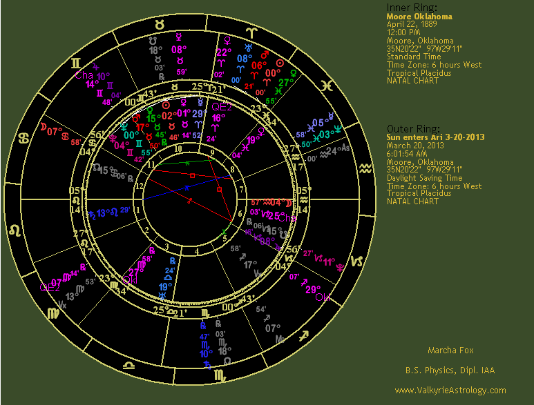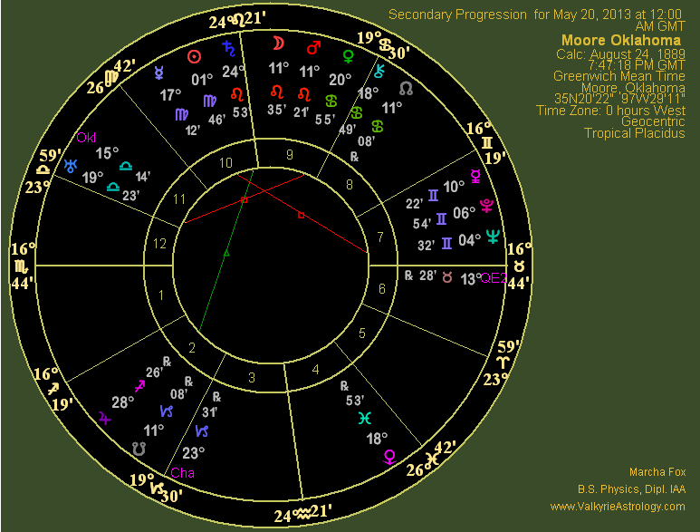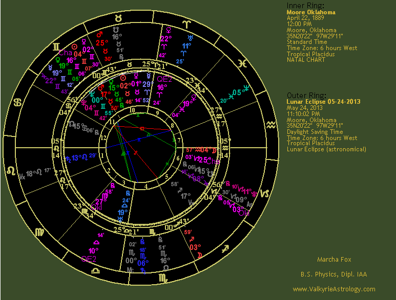 Mars is in debility in Taurus but often has a bulldozer effect which is apparent when you look at the damage wrought. Mars rules the 8th house of death and trines the ascendant, thus delivering his lethal effects. Mars is semisextile Jupiter, also in debility in Gemini where he tends to go in too many directions at once. Jupiter rules the 4th house of home, family and endings, suggesting a heavy influence in that area and conjunct the Midheaven in the 10th, indicating this was an event that would be viewed extensively and receive considerable attention by the public. Jupiter is in partile square with the ascendant, further inflating the effects on the town at a personal level. Numerous planets are in the 9th house which includes beliefs, expectations, higher education, publication, other cultures and long-distance travel. These include Mars, Sun, Mercury, Venus and asteroids Phaethon and Chaos. Undoubtedly news of this horrific storm were published far and wide and it traveled a rather long path. However, what comes to mind is how this town has been hit so many times by massive tornadoes which yields the potential message that these are not isolated events but should be expected to continue. It also highlights the lack of storm shelters which greatly contributed to the injuries and fatalities. Clearly the area had not learned it lesson from previous storms so this one drove it home, a form of higher learning, if you will, that Mother Nature will do as she pleases and it just may be that Moore is on her favorite tornado route for reasons unbeknownst to fragile humans. The Moon in the 1st house hints at the high degree of citywide emotions affected by the tragedy, particularly the deaths at Plaza Towers Elementary and is trining Phaethon, certainly indicative of a "crash and burn" scenario. Phaethon is in close but out-of-sign conjunction with the Sun, interesting in that the Moore natal chart also has a Sun - Phaethon conjunction. When natal aspects repeat by transit significant events often occur. Eris, minor planet of discord, is in the 8th house of death and sextile Jupiter, inflating her ability to stir things up. She is quincunx the ascendant, hopefully pushing for a change of direction and approach to preparedness and safety for the unfortunate towns in this region. |