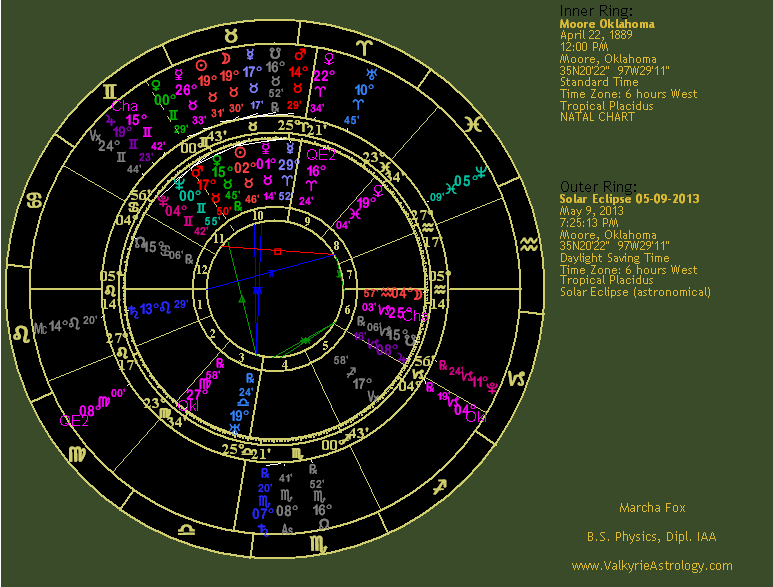 Again there are numerous close aspects for the solar eclipse that occurred on May 9, 2013. Most glaring is the partile quincunx between the Eclipse Sun and Moon conjunction with Moore's natal Uranus, ruler of tornadoes as noted earlier, which is also being trined by transiting Jupiter lending an expansive effect and relating to the size of the storm. Natal Jupiter in the 6th is being sextiled by transiting Saturn and the eclipse ascendant which provides even more expansionary energy, perhaps relating to the destruction with Pluto in the 6th while transiting Jupiter in Gemini, sign of his debility plus an air sign conjures up visions of the tornado's massive size. Asteroid QE2 is also partile trine Moore's Jupiter. Transiting Mars is squaring natal Saturn where the eclipse Midheaven also connects with Saturn ruling the 6th of work and health. The asteroid, Oklahoma, has gone retrograde in partile opposition to natal Pluto and on the cusp of the 6th house of work, service and health. Without belaboring this chart any further you can nonetheless see the repeated hits of the same theme from chart to chart and eclipse to eclipse. One unfortunate aspect and one unfortunate chart are not sufficient to indicate impending disaster. However, when there are so many that all say the same thing it's easy to see how such an event could evolve from the cumulative effect. |