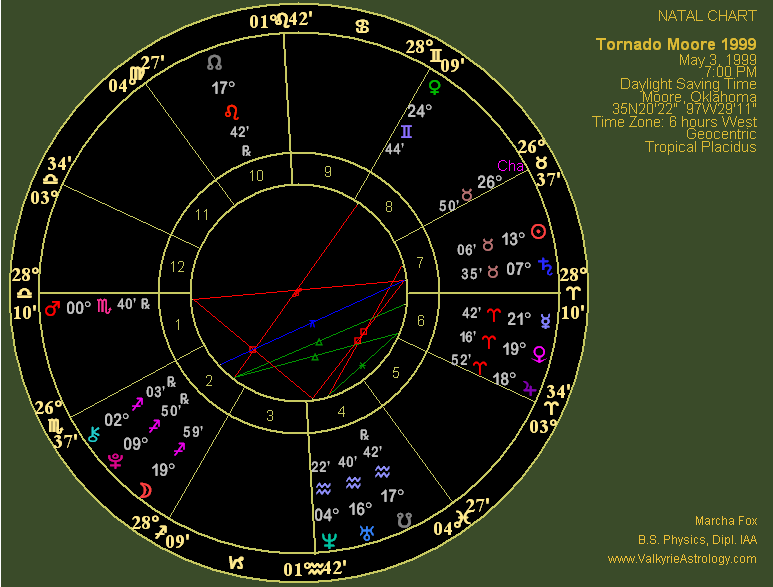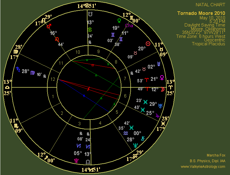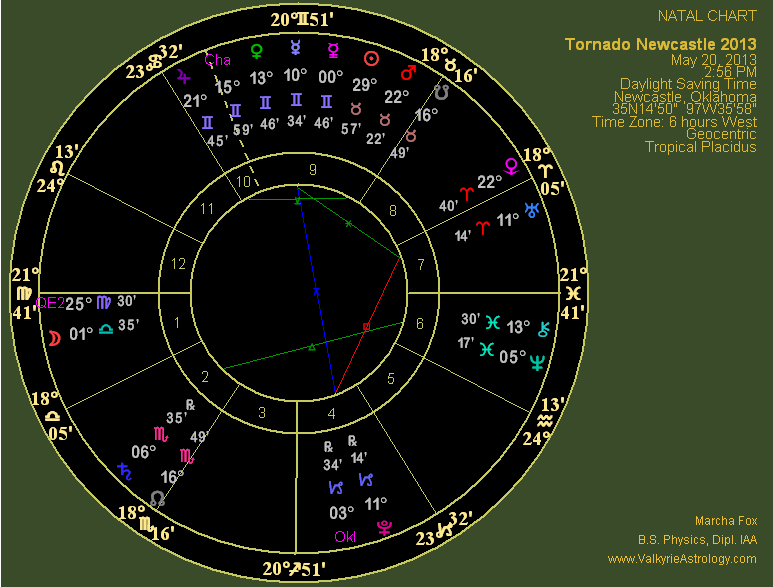 May 20, 2013 Moore Tornado "Birth" Chart This is the event chart for when the Moore tornado formed at 2:56 CDT in Newcastle. At first glance it doesn't look particularly ominous with only one hard aspect. However, but it's a rather bad one that in and of itself defines the chart given that it's connecting Uranus, ruler of tornadoes and Pluto, planet of death in EXACT square in angular houses which provides additional impact and energy. I also find it notable that 1998 QE2, the asteroid that made its closest approach to Earth on May 31, was in the 1st house within about four degrees of the ascendant. This is all the more interesting when you consider that it was in approximately the same house position in the El Reno tornado chart in spite of the fact the quick-moving asteroid had progressed into Scorpio. Pluto is in the 4th house of home environment and endings/new beginnings lending intense, destructive energy in Capricorn, the sign that rules structures. Pluto is also retrograde, suggesting going backwards as far as building is concerned. Uranus, planet of explosions, rebellion, disturbances and the unexpected as well as ruler of tornadoes is in the 7th of relationships and the sign of Aries, the most energetic and aggressive sign as previously noted. Furthermore, the Sun is in the last degree of Taurus; placement in the last degree of a fixed sign often denotes a permanent ending. This square is further strengthened by a closed loop aspect with a third component, Mercury, natural ruler of weather, which is sextile Uranus, natural ruler of tornadoes. A sextile is usually considered a "soft" aspect that denotes an opportunity but in this case the results were far from fortuitous and served to ignite one of the worst tornadoes on record. The final aspect, a quincunx between Mercury and Pluto, connects the natural ruler of weather with the natural ruler of death and destruction through an aspect that is unstable and necessitates an adjustment or change of course. Mercury is less than a degree out of orb, making this an extremely powerful loop of energy. Furthermore, Mercury is in Gemini, sign of his dignity, making him even stronger, plus he's the ruler of the Virgo Ascendant and rules the entire chart. Gemini is an Air Sign and Aries a Fire Sign, two elements that in this case combine a bit too well. Mercury is typically considered a neutral planet, i.e. not benefic and not malefic, but when connected with two malefics he obviously gets into the game.