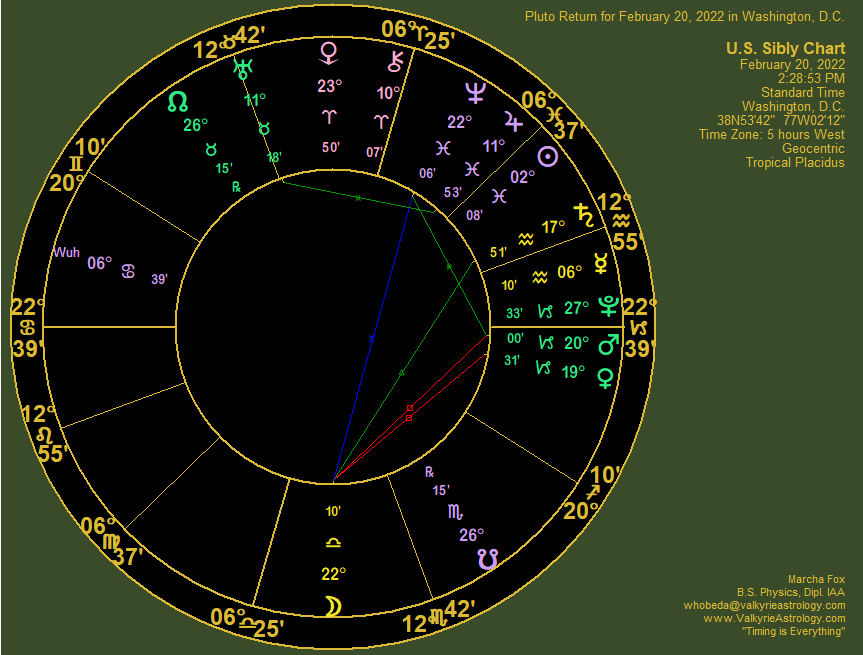When a planet or luminary returns to its natal position, it creates a conjunction with itself. This burst of energy marks an event known as a "Return." Probably the most well-known is the Solar Return, or birthday chart, which provides insights to the coming year. Most parents have never figured out that "the terrible two's" are a result of the child's first Mars Return. The first Jupiter return at around 12 years of age, marks the threshold of adolescence. In some cultures, the Saturn Return, around 29 years of age, was what declared the person an adult. Planetary returns will relate to the energy of that planet combined with the natal house it rules. A Uranus return occurs around 84 years of age, but Neptune and Pluto returns are (obviously) not experienced by individuals. Countries and other entities, however, can. Like most planetary returns, often there are three within a relatively short period of time due to retrograde motion. For the USA the first one occurs on 20 February 2022. I love the symmetry of that date: 2202022. (I'm sure numerologists are having all sorts of fun with it, more specifically what has playfully dubbed Twosday, which occurs two days later on the 22nd, i.e., 2222022, which is conveniently actually a Tuesday! Follow this link for a nice numerological assessment of 2022 in general.) The next Pluto return in this series is via retrograde motion on 11 July 2022, a week after the USA's 246th birthday. The third and final will be between Christmas and New Years Day on 28 December 2022. So what do those charts tell us about what to expect? The country is already in turmoil, perhaps instituted by it's Neptune demi-return, a.k.a. Neptune opposition, which would clearly be a time of division and confusion. Unless a country has a very strong political and cultural structure, that's the perfect prelude to major unrest. And what about Uranus? The USA had its first Uranus return series between 1860-1861. The third return of that series occurred on 2 April 1861. So get this: On 12 April 1861 the US Civil War began. Coincidence? The next Uranus return, which happened to be a single return, was on 30 May 1944, right in the middle of World War II. The next one will be in the 2027-2028 timeframe, so we'll worry about that one later, but it's coming up pretty fast, eh? But this should give you an idea of how astrology works for countries. Skeptics will say it's all coincidence, but anyone with a knowledge of astrology, especially the geo-political variety, will know otherwise. So let's take a look at the Pluto Return charts, their energy, and see if they'll give us a few clues regarding what to expect. 1st PLUTO RETURN 20 FEBRUARY 2022 The next attention-getter is Eris, that troublemaker minor planet that typically represents discord, who's at the top of the chart in the 10th house of status along with Chiron, the wounded healer. This does not bode well right there, but is certainly nothing new. Both are in Aries, showing this is going to be confrontational, even though the Libra Moon is doing everything she can to mediate by opposing Eris from the sign that demands fairness and balance. The Moon is also in partile quincunx with Neptune in the 9th house, which indicates the need for a change of course or direction. The 9th house includes belief systems, including politics, as well as the courts, religious institutions, and the media. Neptune tends to be the cosmic surfactant that dissolves things like your favorite detergent. He's idealistic or illusive, deceptive or delusional, or all sorts of other influences, that are hard to pinpoint or define. Definitely the natural ruler of gas-lighting. This placement certainly reflects the untrustworthy media. The Moon is in the 4th house of endings