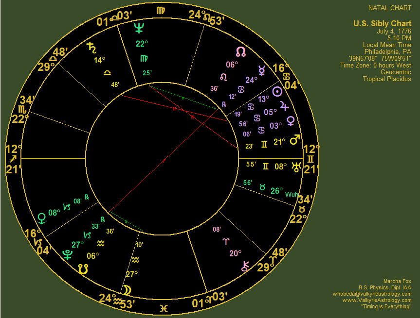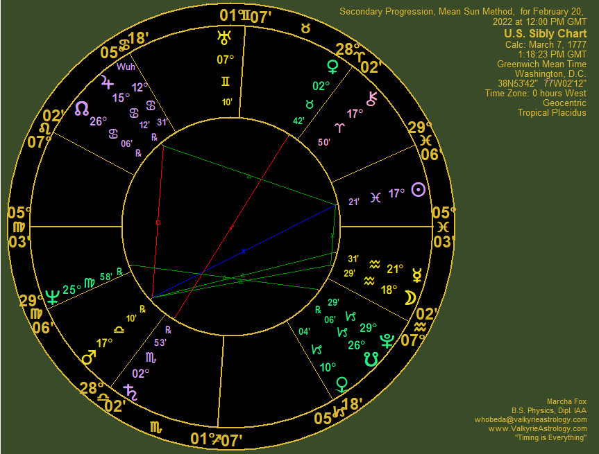 censored into oblivion by now. Mercury in the 7th house in Aquarius is quincunx Wuhan, demanding information. What information is the CCP holding back? Why, if they have nothing to hide? The Mercury - Saturn midpoint continues to square Uranus, which has been the case for quite a while. Uranus is on the cusp of the 11th house, which includes legislative bodies, associations, and the stock market. This could indicate resistance to change or a very difficult, unstable, chaotic disturbance in these areas. Unless you've been living under a rock or getting all your news from MSNBC or CNN, none of this should be a surprise. The chart definitely reflects the current state of the country. Now let's take a look at the US Sibly chart progression to see what clues might be there. How is the USA evolving through time? The tight opposition between Saturn and Venus shows stress between reality and our material security level (think inflation) in the most basic sense. Furthermore, the 3rd house represents communications and infrastructure as well as (e)mail and blogs, while the 9th includes the courts and media. Clearly there is a huge disparity between conventional and unconventional news sources as well. There are two closed loop aspect patterns, one I call a Course Adjustment Loop that comprises Mars, the Sun and Jupiter. The usual meaning of that pattern is that something isn't working, which necessitates a change of course before things can proceed in an easy manner. The conflict is between Mars and Jupiter, where Mars is the natural ruler of disputes, in this case those residing in the 2nd house, which include finances, the treasury, and resources in general. The square with Jupiter in the 11th, which includes legislative bodies such as congress as well as the stock market, definitely represents the money crisis and fiat currency situation. Remember, we don't really operate with a "treasury" these days, but "Federal Reserve Notes." I'm not going to get into a lengthy lesson in economics, but the effects of printing money are easily seen in the grocery store. The quincunx between Mars and the Sun in the 7th house, which includes treaties and alliances, hints at the supply chain issues. The Sun represents the head of government, so let's see if you can figure out who that is. Sadly, what's coming out of there are instructions to Congress to print more money or, conversely, since Jupiter is the traditional ruler of the 8th house, to raise taxes. The other aspect pattern looks like a chopped-off pyramid and comprises Mars, the conjunction between the Moon and Mercury, the Sun, then back to Jupiter. The newcomers are the Moon and Mercury in the 6th house (working class, farmers, army, labor unions, hospitals and healthcare) where the Moon also represents the people, more specifically women and children, as well as waterways and the national mood. Mercury, besides representing information in general, also represents retail trade. These two fit into that Course Adjustment Loop as people try to deal with making ends meet amid an inflationary crisis. The semisextile, a minor aspect that typically indicates friction or an annoyance, connects the Moon and the Sun, which could easily account for the current approval rating of the supposed leader lost in the fog-bound environment of Pisces. Which begs the question, if this is in the country's astrology, would this mess exist no matter WHO is in office? Who's really in charge here? (Pun intended) Mercury rules the 10th house as well as the ascendant and is likewise exalted in the 6th house, where he resides. Take a look at those 6th house domains in the paragraph above and decide which one you'd like to be in charge. Considering how COVID has been handled, I definitely don't vote for the healthcare industry, yet they are exactly who has been in charge the past two years! Think about it. Scary stuff, right? Neptune is in the 1st house, which represents the national identity. To say that it's not what it used to be would be the understatement of the year, perhaps the decade or longer. Even more interesting is the fact that Neptune represents socialism/communism, idealism, pollution, oil, and pharmaceuticals. The trine from Neptune to Pluto (secret societies, revolutionaries, political extremists, etc.) certainly suggests some serious collusion there. Who's raking in obscene profits hand over fist through draconian mandates? Chiron in the 8th house certainly represents the many people injured and dying from the suppression of early treatment protocols relative to the plandemic to say nothing of the vax mandates. Eris, which is the natural ruler of discord, but in geopolitical astrology represents minority groups, factions, and immigrants, is currently unaspected in the 5th house. The 5th house includes children, the entertainment industry, sports, recreation and oddly enough, the Senate. Immigration is certainly an issue, to say nothing of ugly accusations related to the exploitation of children. How much is the entertainment industry rocking the boat and adding to division versus unity? They're definitely putting Eris to good use as is Pluto, whose nature was defined earlier. If you've made it this far, you have plenty to ruminate upon and digest. The Pluto Return and Progressed Charts do a pretty good job of capturing the current situation. Next time let's look at how the first Pluto return on 2-20-2022 interacts with the US Sibly and progressed charts for more hints on how this might play out. |