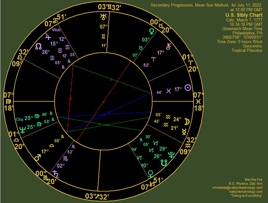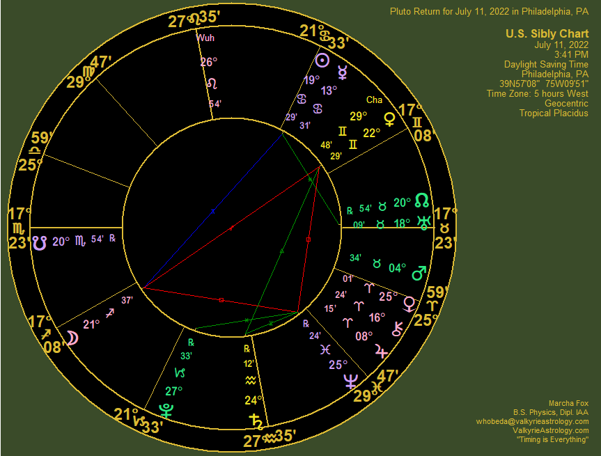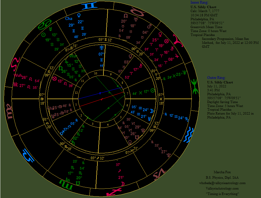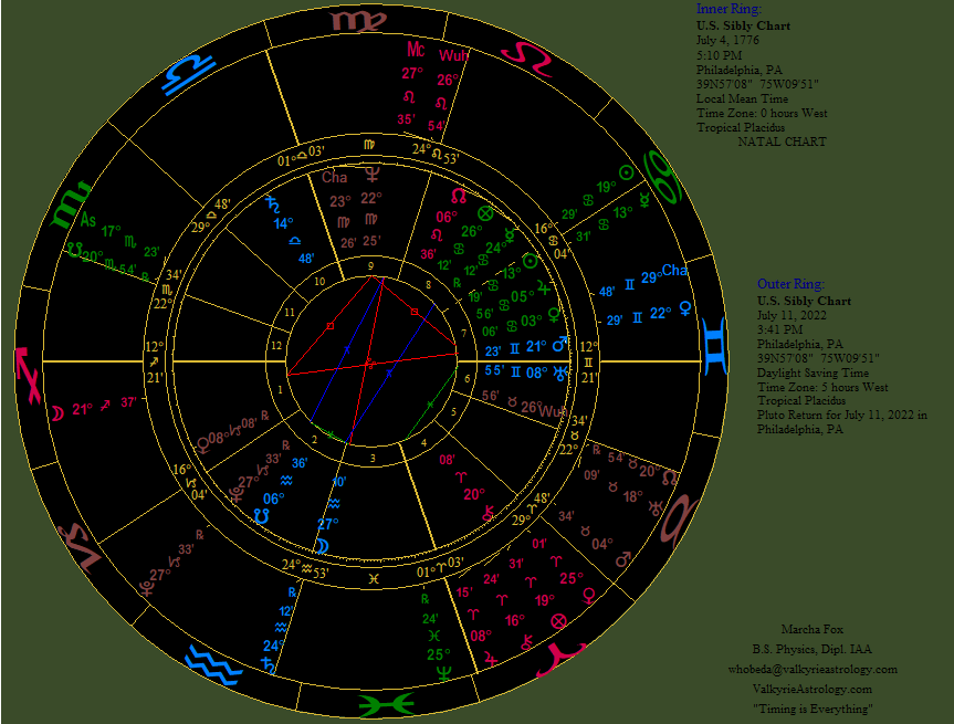occur. That criteria is met even with a fairly tight orb. The 4th house, which represents land values, speculation, and usage as well as family policies and self-perception, has Neptune in residence, the planet that represents socialism, idealism, pollution, oil and pharmaceuticals. Neptune is the cosmic surfactant, dissolving what he touches to say nothing of having the dubious honor of reigning over delusions, illusions, and deception. He specializes in fantasy and confusion. The Moon's reaction to Neptune's domain is not one of approval. Venus is in the 8th house, which includes foreign debts, banking, insurance, military treaties, reserves, and mortality. Deaths have been off the scale since rolling out the COVID vaccine in 2021 per the insurance industry. Note that Neptune rules viruses as well as the pharmaceutical industry, which have upended the planet since 2020. With the Moon representing the people and national mood, clearly there is plenty to be upset about. The Moon's quincunx to the Sun in the 8th shows the need for adjustments or a change of direction on the part of the government. A change relative to treaties and alliances as represented by Uranus in the 7th in sextile to the Sun provides some hints at possible solutions. Is the government cutting off its nose to spite its face with its relationship to other countries? Or with its own people? Venus is trining Saturn retrograde in the 3rd house, which relates to communications and infrastructure as well as primary education. This indicates the need for restructuring in a transformational way. Not only is the aging infrastructure an ongoing problem that has been neglected for too long, but primary education is an issue as well as various unsavory agendas creep into schools. This is alarming numerous parents who are being systematically cut out of the loop regarding what their children are taught, then stalked by the FBI when they speak up. Since when are concerned parents a threat to national security? Saturn semisextile Neptune shows irritations and annoyances with these policies, as if there's not already enough to worry about. (It's worth noting that by turning the chart, government employees are the 6th house from the 10th, i.e. the radical 3rd house where Pluto and Saturn reside, suggesting hostile overreach.) Pluto retrograde is in the 3rd house of infrastructure and education as well. Pluto retrograde is the cosmic roto-rooter that digs out corruption and exposes it so it can be cleaned up. His sextile with Neptune has numerous indicators of a target-rich environment that ranges from socialism to the newly created oil crisis, to say nothing of the pharmaceutical industry's heap of dirty laundry in the wake of the COVID debacle, also in Neptune's domain. Pluto is quincunx the Midheaven, suggesting the need for a change of direction or adjustment regarding the economy, treasury, and resources in general as they affect the U.S.'s status. The 5th house includes children, entertainment, sports, recreation and oddly enough, the senate. It is occupied by Jupiter, Chiron, and Eris. Chiron, the wounded healer, definitely points toward issues in these areas. Children and sports figures have had a much higher mortality rate since the advent of the vaccines. Eris, goddess of discord, also represents minority groups, factions, and immigrants. The partile semisextile with Neptune (not shown in chart) shows irritations in those areas, particularly the border crisis. The sextile from Eris to Saturn indicates restructuring is advised in those areas as well. Mars represents the military, fires, and disputes. His presence in the 6th house relates to the working class, farmers, army, labor unions, hospitals and healthcare. Mars is unaspected, making him particularly strong. In Taurus he functions like a bulldozer--strong, determined, and relentless. Farmers are unable to harvest their crops due to the fuel shortage, to say nothing of fertilizer being in short supply as well. The working class is being hit the hardest by inflation. Hospitals and the healthcare industry had their way with the people for the past two years, their failed treatments and policies relative to COVID gradually being exposed through the sextile between Pluto and Neptune. Looking at the biwheel below that shows how Pluto return #2 lines up with the U.S. Sibly chart will tell us even more of what this second wave will bring. That T-square is still there, but this time it's connecting with Sibly Neptune instead of transiting Neptune. As noted in a previous blog, the Neptune demi-return occurred in March. House influences now switch to the Sibly chart where the Moon is transiting the 1st house, which includes the national identity and populace, showing they are not happy. Sibly Mars in the 7th house replaces Venus as part of the T-square, showing the people are not happy with our relationship with other countries. These could be those south of the U.S. border as well as what's going on with Russia and Ukraine. Neptune in the 9th house reflects controversy over such things as the courts, religious institutions, and the media. There's a definite target-rich environment for the people to object to. Return Saturn is on the cusp of the 3rd house, but retrograde and thus backing into the 2nd house of the economy and resources, which definitely need to be rebuilt. The quincunx to Sibly Mercury retrograde in the 8th shows issues related to the demise of trade in various venues and the struggles of retail establishments. Return Jupiter in the 4th house is sextile Sibly Uranus in the 6th, suggesting major change. Note that the 4th house, besides being land and family policies, also includes the opposition party. The sextile to Uranus implies a major change there as well, as people absorb what is going on and who's to blame. It's interesting to note that Eris is transiting the 4th. This hints at how minority voters are switching parties these days as their interests are being 