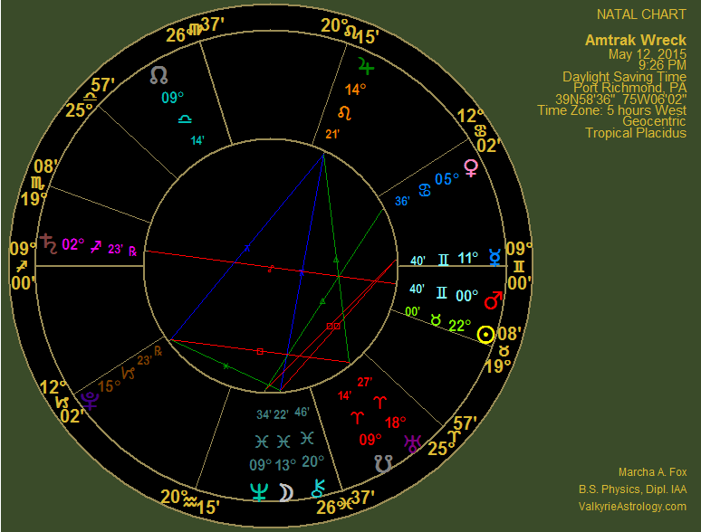 Mercury, natural ruler of motion and travel, was squaring the Moon as well as Neptune, suggesting confusion on the part of the engineer given that the train was moving much to quickly for that part of the route where the train's speed should have been reduced by half. The engineer is represented by the 6th house of workers which is ruled by Venus who is trining Neptune, planet of confusion and deception. Both Jupiter and Pluto are part of an aspect pattern I refer to as a Course Adjustment Loop which has been in place for a while now and will continue to be. I typically interpret this pattern to indicate a crisis which brings about a change of direction which in this case unfortunately was literal and took the train off the tracks. Uranus in Aries in the chart's 4th house is the third member of that loop, bringing him into the picture. He's connected to Pluto, natural ruler of revolutionaries and political extremists, by a square and Jupiter by a trine. This is a rather ominous combination. Uranus is the planet of surprises, upsets, disturbances and unexpected events who was residing at the time in the 4th house of endings and new beginnings. Uranus is the modern ruler of Aquarius and thus ruler of the 3rd house of local travel which would apply to a commuter train. While Jupiter is often considered lucky, this is another case that shows that is often untrue. Jupiter is mostly neutral as the higher octave of Mercury and simply inflates and increases what he touches with the easy energy flow of a trine not always delivering favorable circumstances. This loop thus implies an attack by extremists with excessive, transformational/deadly results. Mars had just entered Gemini from which he's opposing Saturn, another malefic planet, residing in the 12th house which includes hidden enemies and self-undoing. Mars is also the traditional ruler of the 12th with it's Scorpio cusp. Saturn rules the 2nd of possessions and substance and is the traditional ruler of the 3rd which includes local travel. This combined with Mars' placement in the 6th house of work suggests an attack against a commuter train with its passengers in most cases returning home from work. The asteroid Chiron, the "wounded healer," in the 3rd house of local travel, also fits the situation of injuries during a commute. This chart is so "textbook" it doesn't deserve much more commentary. It's interesting that the ascendant at 9:00 Sagittarius forms another aspect pattern known as a Triangle of Potential with the Lunar Nodes while Neptune, modern ruler of the 4th house of endings, is tickling the South Node. The Nodes tend to bring important events that lead to a new direction. UPDATE May 17, 2015: News reports are now claiming that the train may have been hit by a projectile prior to the crash, distracting or even injuring the engineer. He was relatively new to that route, having been on it for only three weeks. This projectile issue is rather interesting given the fact that two other trains where hit in a similar fashion at approximately the same time. Hidden enemies are included in the 12th house which has a Scorpio cusp traditionally ruled by Mars. Saturn is resident in the 12th and rules the 2nd house which in mundane astrology includes resources in general. Saturn is also the traditional ruler of Aquarius, the 3rd house cusp, which includes roads and railways. Mars and Saturn are in opposition, a hard aspect that suggests aggression for an unknown enemy directed at the train system. Mars in the 6th house of workers fits the engineer being attacked at the personal level since the projectile apparently came through the windshield. The Sun rules the 9th house which includes the media as well as other cultures. One aspect involving the Sun is a separating sextile with Chiron, implying the opportunity to bring injury. If you look a bit closer, however, you can see that the Sun is forming a T-square with the cusps of the 3rd house of local travel and 9th of other cultures which suggests, albeit subtly, the possibility of terrorism. The National Transportation Safety Board (NTSB), the agency that investigates all transportation related accidents, has asked the FBI to assist, specifically due to the technology they can offer the investigation. Or so they say. Time will tell. Perhaps. The public, represented by the 10th house which just happens to be ruled by Mercury, may not ever know because that square between Mercury and Neptune suggests deception. Thus, there's a high probability that all the facts in this situation may not ever be known or at least disclosed to the public. CBS Philly News has the details of the accident and follow-up articles which is where I obtained the information for this astroblog with follow-up information from network news channels, which I don't always believe, but what they say is interesting to say the least. |