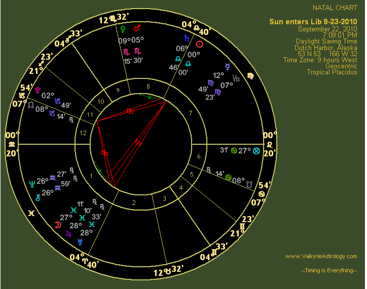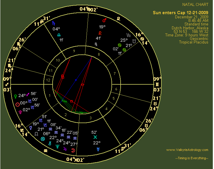 Neptune, King of the Deep, is, as you would expect, the natural ruler of the fishing industry. The fact that Neptune is cozied up in the same degree with the asteroid, Chiron, a.k.a. "The Wounded Healer," doesn't bode well. Their location in the 1st house which represents Dutch Harbor, generally, or the physical and emotional climate for the coming three months in that area, suggests that this will not be the best of times. There will be disappointments, illusions, and deception at all levels which will take their toll. Neptune's association with the Moon likewise isn't exactly fortuitous. Their connection is by semi-sextile (shown by the short green line in the 1st house), an aspect that typically indicates an opportunity which is going to take a lot of work to achieve success. The Moon also has emotional implications, particularly in Pisces, sign of the Fishes and don't forget the Moon also rules the tides. The Moon rules the 6th house of work and service which includes the crew members, throwing her stirred-up vibes in that direction; emotions will be charged and deep. Neptune and Chiron semi-sextile the Moon show there would be a lot of hard work to say nothing of some emotional pain involved. The 6th house also involves health so this location and other planets associated with the Moon suggest some surprises with regard to health as well. Jupiter, which tends to expand and exaggerate what he touches, is conjunct Uranus, planet of surprises, disruptions, sudden change, breaking free and rebellion. Certainly not a very friendly combination, particularly in Pisces, a sign which tends to be dreamy and somewhat out of touch with reality. This planetary pair is in tight conjunction with the Moon as well, stirring up the emotional climate even more to say nothing of the sea itself; this combination definitely points toward monster waves and weather surprises, especially them being located in a Water Sign, and a Mutable one at that. Don't forget they are also part of the T-square, indicating this will be a major player as far as tension is concerned. This is well represented by the Sun opposite them in the 7th house of close relationships as well as partnerships and competitors. With the Sun approaching the cusp of the 8th of transformations, death and regeneration, however, his light will shine in that venue as well; shared resources and debt are also residents of the 8th so are likely to show up as well. Captains who have partners in the ownership of their vessel and equipment or may simply be employed by the owner, are going to encounter some opposition from this area as well. Crew morale also looks as if it will be a significant issue. Mercury and the Vertex, which represents fated events, are in the 7th. These two are in Virgo with Mercury, as the ruler of this sign, in his dignity and exaltation, allowing him to function to full capacity, giving him tremendous power here. Mercury rules movement, conveyance of goods, and all types of communications. Mercury is generally neutral in character and in this placement should facilitate communications. Virgo is a critical, meticulous sign, however, which will reflect in conversations; people could expect too much from each other, up to and including perfection. This is further intensified by the fact that Virgo is intercepted, an astrological term used to describe a sign that does not appear on any house cusp, shown by the radial lines with the cusp zodiacal location shown in the outside ring. The allows this energy to build up and intensify like a pressure cooker without a relief valve. Communications could thus be of an explosive nature. Venus and Mars are in the 8th House, also, in a wide but viable conjunction. Mars is in his traditional rulership in Scorpio, giving him extra strength whereas Venus is debilitated. Scorpio is all about obsession and passion which in the 8th has free reign since Scorpio is the zodiacal ruler of the 8th. Mars is the planet of energy and action which in this case will reflect the character of its resident sign, i.e. obsession and passion. Mars in the 8th is typically a placement to be wary of as it can point toward accidents; this is not a time to take unnecessary chances. Venus, natural ruler of money and income, is peregrine, in other words not aspecting any planets, which doesn't help her debilitated state. Money could be an issue this trip. Mars as the ruler of Scorpio also rules the 9th house which includes long-distance travel. This puts an extra measure of energy, aggression and risk to this part of the picture.