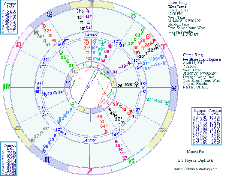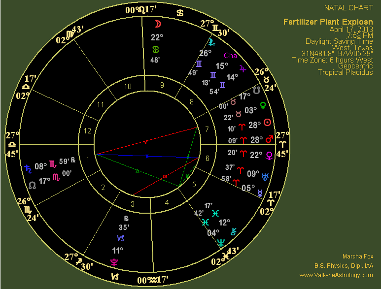 Uranus is also quincunx retrograde Saturn which hints at the extent of rebuilding that will be required to bring this unfortunate town back to normalcy and also suggests the explosive rupture of the huge storage tank. Sign placement with Uranus in Aries, a highly energetic sign and Saturn in Scorpio, the sign that rules death, carry subtle significance as well. Saturn is at 8 degrees, a critical degree for Fixed signs, giving it additional influence. The Moon is dignified in Cancer squaring Eris, imparting a strong emotional element as well which will extend to the public. The Moon is also intercepted in Cancer, increasing the emotional component in the 9th house which includes beliefs, expectations, legal matters and academia with implications toward future litigation. The 10th house is empty which implies this event may not receive that much national publicity, perhaps due to being overshadowed by the Boston Marathon bombing two days before. The Leo Midheaven is ruled by the Sun but likewise squared by it, hinting at unfortunate news further reinforced by the fact the Sun and Mars are both setting. Pluto in the 3rd house which includes neighbors is applying to a square with Uranus in the 6th house of work and health, showing the effects of the explosion brought trouble and death to those that lived close to the plant. Pluto, like the Moon, is intercepted in Capricorn which could indicate hidden problems that contributed to the explosion. Pluto is sextile the asteroid, Chiron, "the wounded healer" which is typically involved in some fashion in disaster charts which involve personal injury. Neptune, ruler of liquids and chemicals, is sextile Venus, the chart's ruler as well as ruler of the 8th house of death, showing a connection there. Like Saturn, Neptune is also at a critical degree, this time for a Mutable sign and likewise strengthening its effects. These two planets can also draw compassion and love to this small town as they deal with this disaster. Neptune is semisextile Mercury in the 6th, an aspect that typically indicates an opportunity that will require effort to pursue. It can also represent an irritation with Mercury ruling the 9th house of legal matters and beliefs as well as the 11th of groups, friends and goals. Undoubtedly a host of lawsuits will derive from this incident. Neptune, which also represents delusions, idealism and deception is in the 5th house which includes children as well as speculation, somewhat related to the proximity of the middle school which gratefully was not in session at the time of the explosion. Apparently whoever decided to locate the school in that location flunked chemistry, especially the concept of exothermic reactions to say nothing of statistics and probability. The chart ruler is Venus which is located in the 7th house of relationships and professionals and rules the 12th house of self-undoing and hidden enemies. A wide opposition to Saturn retrograde suggests structural issues or noncompliances at the plant may be at issue with Saturn ruling the 4th house of home environment as well as endings. Mercury rules the 9th and 11th houses which has a variety of implications which include the possibility of sabotage or terrorism due to the 9th including belief systems and the 11th, groups, but this is insufficient evidence to be conclusive. More will undoubtedly come out as the investigation continues but Pluto intercepted and retrograde in Capricorn seems more indicative of hidden problems with the plant infrastructure with the information coming out in the course of the investigation.