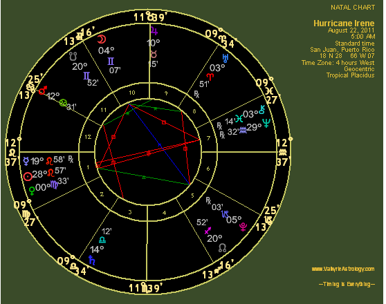 Uranus, planet of disruptions, disturbances, explosions and other unpleasantries which sneak up on you, was in the 8th house of intense experiences and death and sextile the Moon, implying emotional trauma which is certainly applicable to those unfortunate enough to be in Irene's long and destructive path. The Moon, ruler of the 12th house of hidden enemies, is clearly visible in the 10th house of status and quincunx Pluto and sextile Uranus as well as at the apex of a loose but viable T-square. Uranus is semi-sextile Chiron, the "wounded healer," also implying sudden or unexpected injury or death with water implied as the cause due to Neptune's proximity. Pluto and Uranus