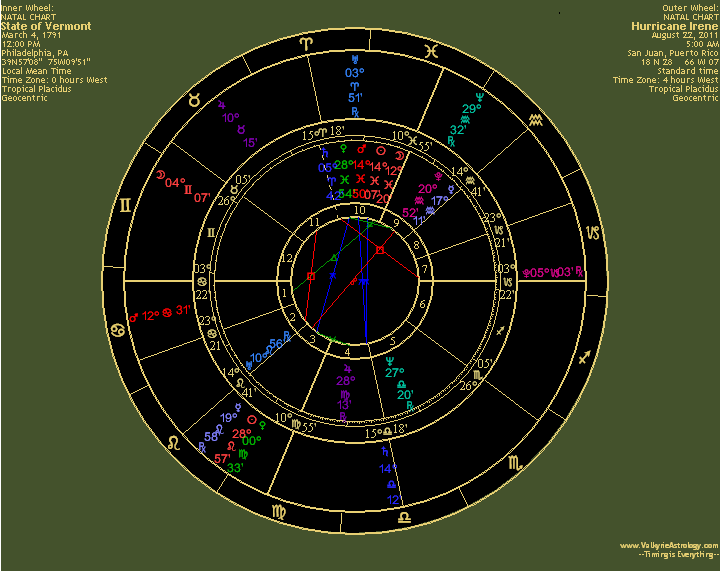 saved lives. Since the hurricane ultimately had such a broad path it's difficult to decide which area to choose for a bi-wheel but given that Vermont was hit so hard it seems a likely candidate. Vermont became the first state after the original 13 colonies on March 4, 1791 and I am assuming that this occurred in Philadelphia, Pennsylvania, the capital city at that time. The time is unknown so I'm ignoring the ascendant and houses. Nonetheless, the partile, or in the same degree, aspects between Irene's and Vermont's charts are interesting. Transiting Jupiter is squaring Vermont's Uranus, implying a disruptive event of massive proportions. Irene's Sun is quincunx Vermont's Venus, also partile, which suggests public sympathy for a state which largely lies behind the scenes. Irene's retrograde Pluto is opposite the state's Pluto and Irene's Pluto is squaring its Saturn, also partile, and suggesting massive destruction. Irene's Mars is trining Vermont's Moon, another partile aspect, both in water signs and suggesting attack from water, if you will, with an emotional impact. Irene's Saturn is quincunx both Vermont's Sun and Mars, further indication of structural trouble. The hurricane's Neptune is semi-sextile its target's Venus which is exalted in Pisces. I don't know about you, but IMHO, with six partile aspects and two others within a degree of orb, correlation beyond the expected statistical hits seems reasonable. |