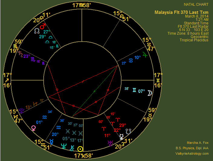 Passengers are often associated with the sign, Gemini, where the Moon, ruler of the 8th house of death, is placed and setting. The Moon is within the 6th house of health, work and service with the square with Neptune implying the possibility of the plane ditching in the water. Neptune at the bottom of the chart has implications for the plane being in the depths of the ocean as well, particularly considering the trine to Jupiter, ruler of the chart, also in a water sign, and representative of the flight itself. Obviously of the thousands of flights that occur daily several of them will have 8th house planets and aspects which will not result in problems. Nonetheless, an event chart will capture its essence. Neptune could also indicate asphyxiation or loss of cabin pressure as suggested by news reports. Those of you familiar with astrological charts may be wondering which planet is placed in the 5th house next to the Lunar South Node. It's white and looks similar to Mercury but it's actually the asteroid, Phaethon, son of Apollo, who lost control of the Sun God's chariot and crashed into the Sun because he over-estimated his abilities. This asteroid is often associated with accidents. The quincunx to Saturn suggests a change of course or direction and being the "crash and burn" asteroid likewise does not look favorable placed in the 5th house, which includes speculations and ego. Perhaps difficulties were encountered that went beyond the skill of the crew to negotiate. Nonetheless, evidence regarding the plane's location and altitude suggests a positive degree of piloting skill. Mars retrograde and unaspected in Libra in the 11th house of groups suggests the numerous countries participating in the search yet not necessarily working together in an organized manner. Being retrograde points toward the lack of progress and not getting anywhere with the search. Note that the Sun, ruler of the 9th house that includes long-distance travel, is in a water sign at the bottom of the chart which suits the trip across water but could also be indicative of ditching, especially with the asteroid, Chiron, the "wounded healer" between Neptune and the Sun. The Sun rules the 9th house, which includes long distance travel, other cultures, as well as beliefs and expectations with the Sun in the house of endings and new beginnings, which could also relate to a hijacker. Neptune is the planet of deception as well with its prominence in this chart indicative of numerous possibilities. Looking at the chart for the last