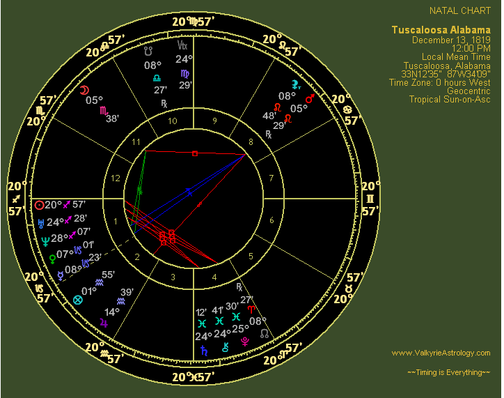 The Ascendant degree, 22:09 Virgo, was not looked on favorably by Valens who described it as within those degrees which “commit outrages on men and lead them into bondage and mutilation and tortures and custody.” The Midheaven degree of 21:30 Gemini was seen as “toilsome, destructive and raw.” Aries Ingress Asteroids Kalliope, named after one of the Muses and a daughter of Zeus, is conjunct Mercury, the only asteroid in Aries at this time with a cluster trailing in Pisces in the 6th, implying health issues. Kalliope is the muse of epic poetry and eloquence but can be an instigator for less pleasant things as well; inspiration isn't always related to favorable situations. For example, Adolph Hitler had Kalliope in his 12th house of angels and demons in partile sextile to task master Saturn in his 10th of public image and reputation. He may have been inspired but certainly not in pleasant ways. As far as Mother Nature is concerned, this certainly was an epic work with the asteroid egging Mercury on to excessive movement. Ms. Discord, Eris, is at 21:34 Aries, partile sextile the Midheaven. Chaos at 12:02 Gemini is partile sextile Jupiter, lending additional energy to Jupiter’s expansive influence. So many partile aspects is unusual in and of itself. Aries Ingress Fixed Stars As if the Sun being in a partile conjunction with Uranus wasn’t enough, the “shipwreck” star, Scheat, was there as well. Robson describes this star coupled with the Sun as "Danger through water and engines, liable to accidents or drowning." Pluto, also angular, is conjunct Facies, the eye of the archer and most evil star in the sky as noted earlier. Alpheratz in the constellation Andromeda, the “freedom and movement” star according to Brady, located at the midpoint of Jupiter and Mercury certainly was ominous as well. The ancient astrologer Manilius described Andromeda's effect as ""The man whose birth coincides with the rising of Andromeda from the sea will prove merciless, a dispenser of punishment, a warder of dungeon dire; he will stand arrogantly by while the mothers of wretched prisoners lie prostrate on his threshold, and the fathers wait all night to catch the last kisses of their sons and receive into their inmost being the dying breath. From the same constellation comes the figure of the executioner, ready to take money for a speedy death and the rites of a funeral pyre, for him execution means profit, and oft will he bare his axe; in short, he is a man who could have looked unmoved on Andromeda herself fettered to the rock. Governor of the imprisoned he occasionally becomes a fellow convict, chained to criminals so as to save them for execution. [Manilius, Astronomica, 1st century A.D., Book 5, p.351.]" That certainly sounds about as ominous as you can get. Ras Algethi in the constellation Hercules, signifying “seeking order” conjunct the IC also provides a subtle warning as does Elsbeth Ebertin's description as corresponding to boldness and a drive to gain power. Sadalsuud in Aquarius, luckiest of the lucky in some texts, was considered by Robson to produce "strange events" when connected with Venus. Deneb Algedi in Capricorn, also connected with Venus in this chart, was indicative of "family difficulties" according to Robson. Arabic Parts The most significant Part in the ingress chart represents extravagance and discord and is conjunct Saturn, indicating extreme destruction. Mars is at the midpoint between the Part representing the death of parents and that which represents servants and service, all in the 6th house of health and the common people. Why Tuscaloosa?