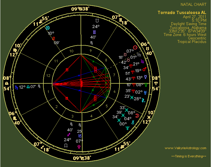 Venus rising before the Sun makes her the Goddess of War and she's in partile (same degree) opposition to the Ascendant, making this attack very personal for the people of Tuscaloosa. Using a wide orb, all planets in aggressive Aries are opposing Saturn, ruler of structure. The Sun is in the 8th house of death and trining Pluto, god of the Underworld and natural ruler of the 8th, with Pluto squaring Saturn as well as Uranus which brings surprises, disruptions and explosions, which were numerous as transformers blew away in the tornado's path. Warrior Venus and Mercury are in Aries, all components of the Grand Cross, the most stressful aspect pattern there is, and normally comprising four squares and two oppositions. However, this Grand Cross has 10 squares and 9 oppositions! The 8th house is also the house of transformations and intense experiences along with debt and shared resources; clearly those who survived this horrendous event will never be the same and the financial implications are staggering. The Sun is quincunx the Ascendant, indicating an adjustment or trouble on the way. The Moon in Pisces, Sign of martyrs and saviors and the zodiacal 12th house, is in a sextile pattern with both the Sun and Pluto, indicating the emotional impact of the event upon the common people and also implies the extent of physical injury and death incurred. The Moon is in partile quincunx to the Ascendant, combined with the quincunx from the Sun forming a Yod, also known as a Finger of God, with the Sun (blue arrow with green base in chart.) It doesn't take much imagination to see the yod and multiple oppositions as a type of the tornado itself by shape and form. Yods typically literally point to significant, life-changing, and fated events. The presence of the asteroid Chiron, the "wounded healer" in the 6th house of health is also apropos. Uranus, Venus and Mercury all square the Midheaven, representing the public nature of the event and the affect it would have on Tuscaloosa's public image, with all contributing to the Grand Cross; this was not the usual run-of-the-mill tornado only seen on "Storm Chasers" or The Weather Channel. This tornado broke records and will go down in the history books; so far it is the 2nd deadliest outbreak on record; when all is said and done it could be the 1st. Reinforcing this significance are the Vertex in the 8th house of death and transformations suggesting a fated situation, with the South Node in the 9th indicating loss which will affect its university and churches and receive vast attention from the media, worldwide.