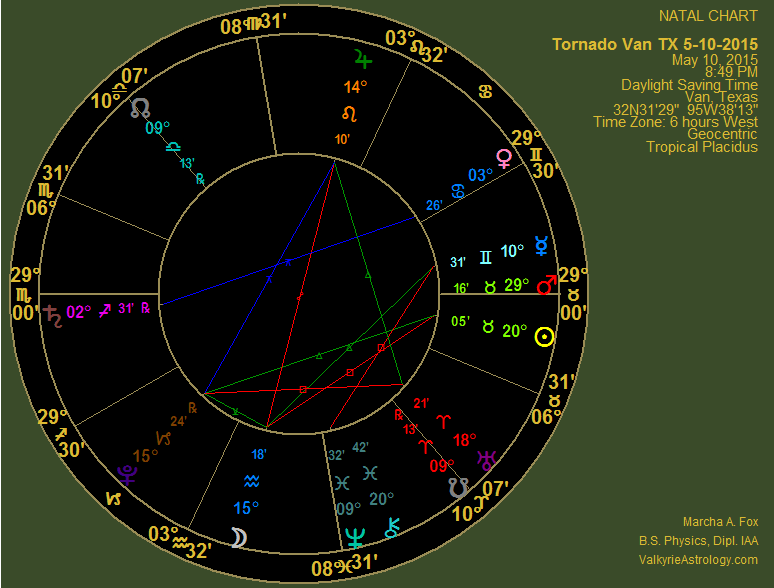 Just before 9 p.m. on Sunday, May 10, 2015, what was later determined to be an EF-3 tornado wiped out approximately 30% of Van,Texas, a small town outside of Dallas. I couldn't find the exact time so I used 8:49 p.m. which looked pretty likely given the ascendant that yielded. Again, like with the Amtrak wreck which occurred a few days after this tornado, or just about any tragic event chart I've studied, I was not particularly surprised. I can always count on 8th house involvement as well as aspects with Pluto, Mars, Saturn and Uranus as well as Mercury when speed is involved. Jupiter is often prominent in tornados as well. What stood out on this one is the 29:00 Scorpio ascendant. Twenty-nine degrees, particularly of fixed signs, has a rather bad reputation. It is often associated with a permanent ending. As the final degree of a sign before the next one takes over it has accumulated all the energy from its previous journey which then quickly dissipates as the next sign takes the cosmic baton. Scorpio is the sign that rules death though in this case there were less than expected for such an event. This could be partly due to Venus in the 8th house of death and ruler of Taurus which comprises the 6th house of health and 7th house of relationships as well as the 11th of friends and groups. Her quincunx to Saturn suggests some adjustments with Saturn the traditional ruler of the 3rd house of neighbors. Mars is often the culprit and it's interesting to note that he's at the infamous 29 degree mark of Taurus, in partile opposition to the ascendant. Mars is in debility in Taurus but don't think his power is diminished. It may slow him down, but I see him as more of a slow-moving bulldozer in that sign. With the 2nd and 8th houses also having their cusp at 29 degrees, that energy would reverberate off of them as well. The 2nd is the house of material possessions and the 8th, as noted above, includes death and transformations. Mercury, natural ruler of motion, rules the 8th as well as the Midheaven. He forms a Triangle of Potential with the 5th comprising children, ego definition, speculation and entertainment and the 11th which includes friends, goals, groups and networking. These are relatively friendly houses which could have mitigated his power somewhat. Nonetheless, Mercury is in Gemini, a sign he rules, placing him in dignity.